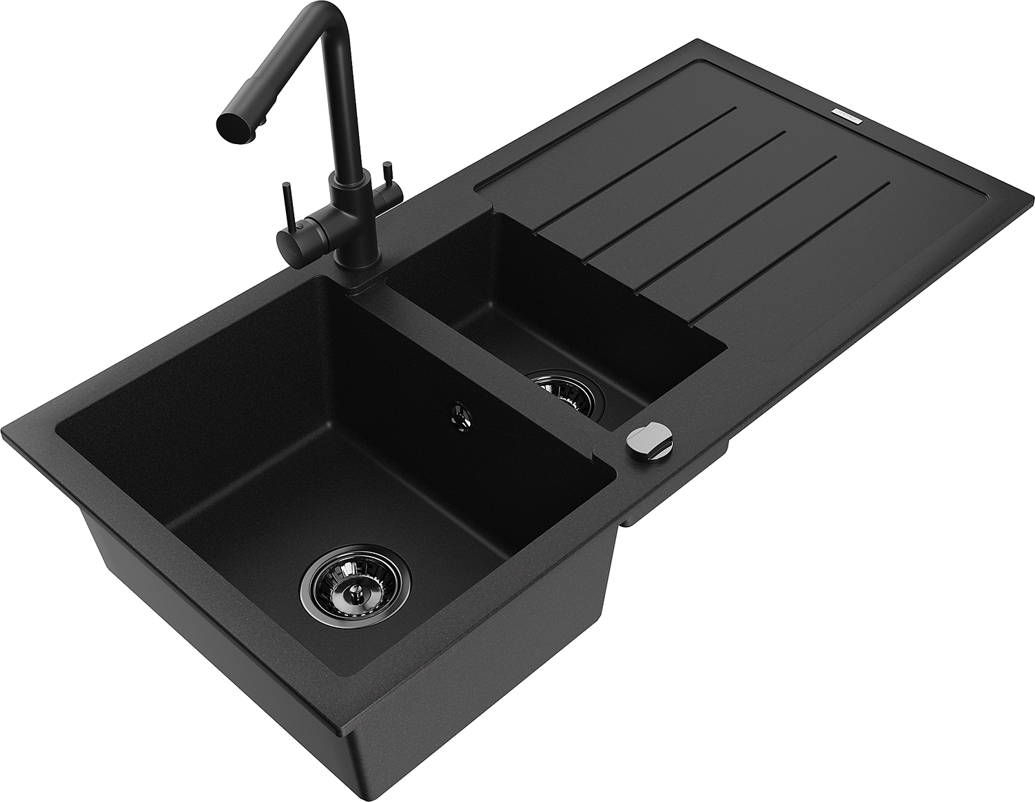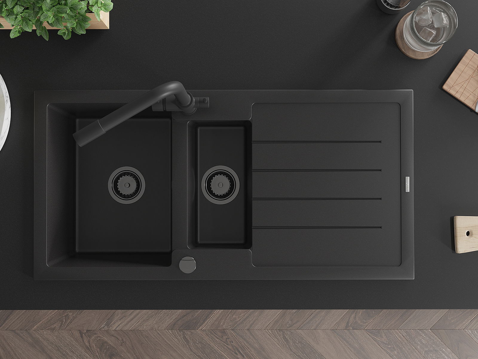 Mexen Andres Granite Sink 1.5 Bowl with Drainer and Duero Kitchen Tap, Black - 6515-77-671600-70-B