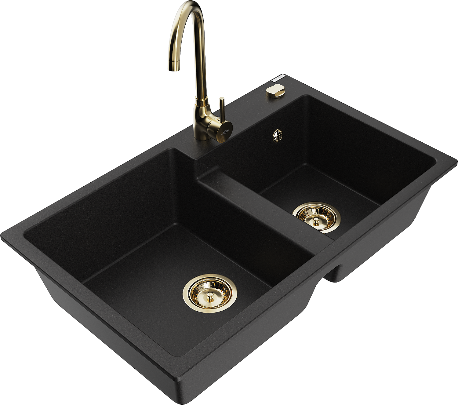 Mexen Tomas granite sink 2-bowl with Telma kitchen tap, black - 6516-77-670200-50