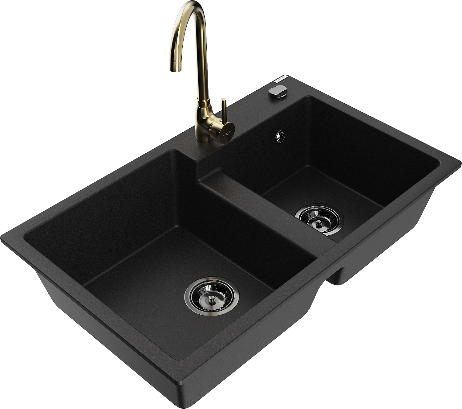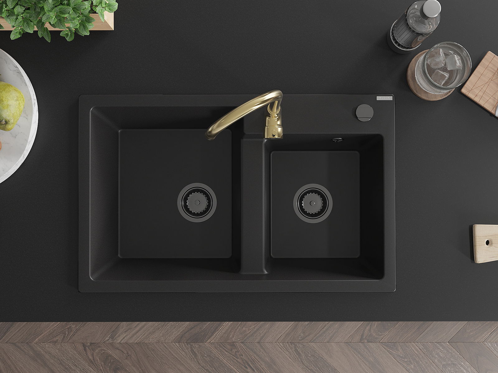 Mexen Tomas granite sink 2-bowl with Telma kitchen tap, black - 6516-77-670200-50-B
