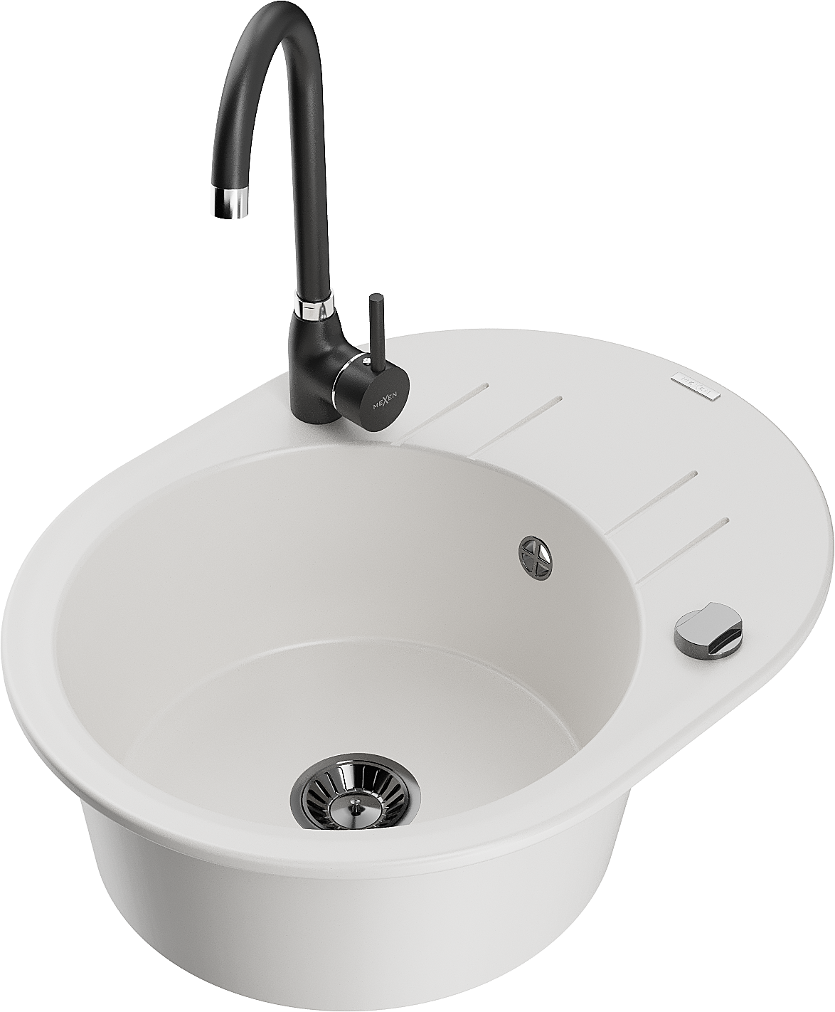 Mexen Kevin single-bowl granite sink with drainer and Telma kitchen tap, white - 6517-20-670200-70