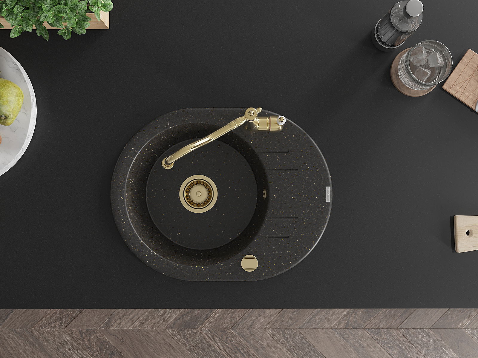 Mexen Kevin 1-bowl granite sink with drainer and Carla kitchen tap, black/gold metallic - 6517-75-670700-50