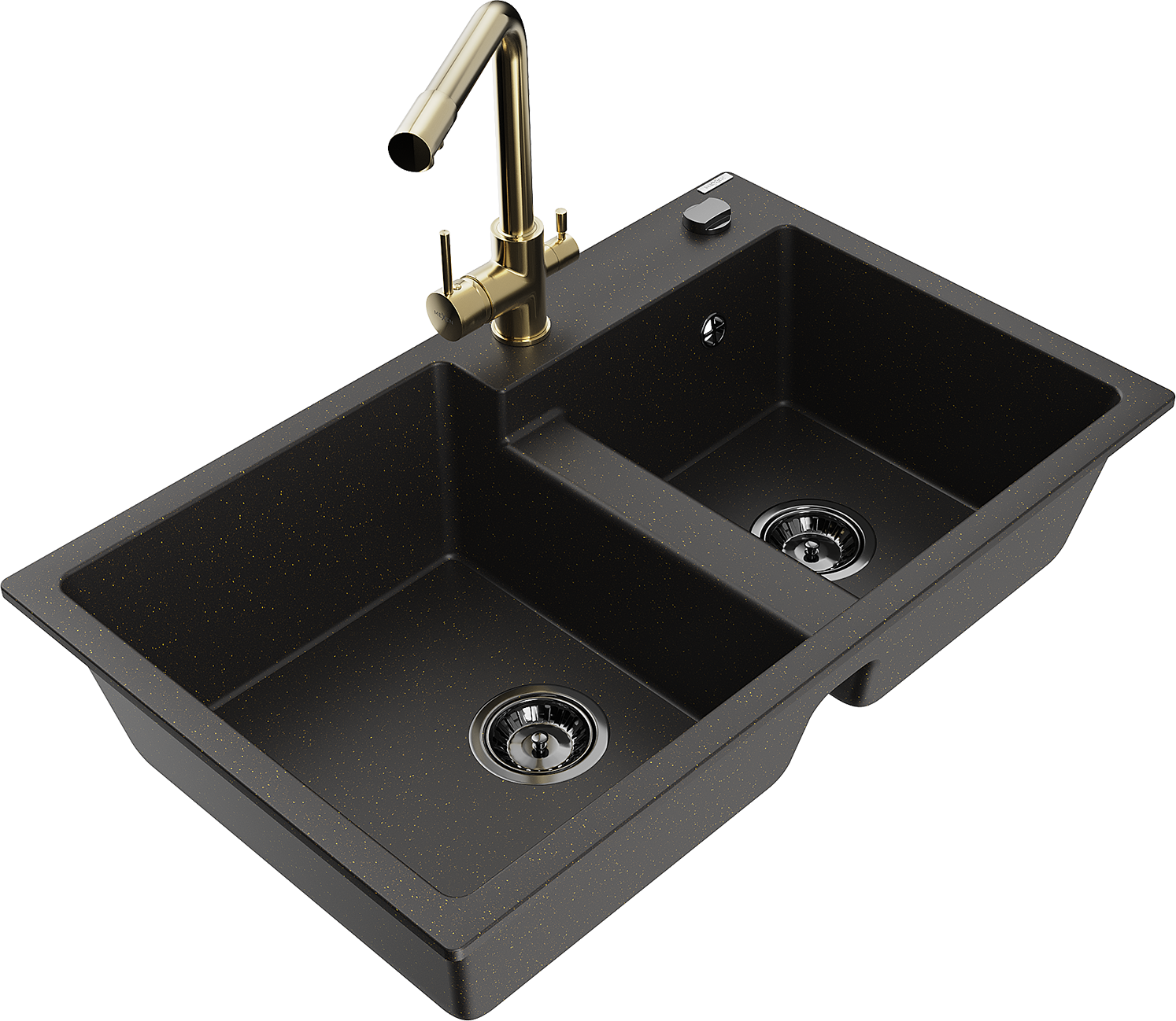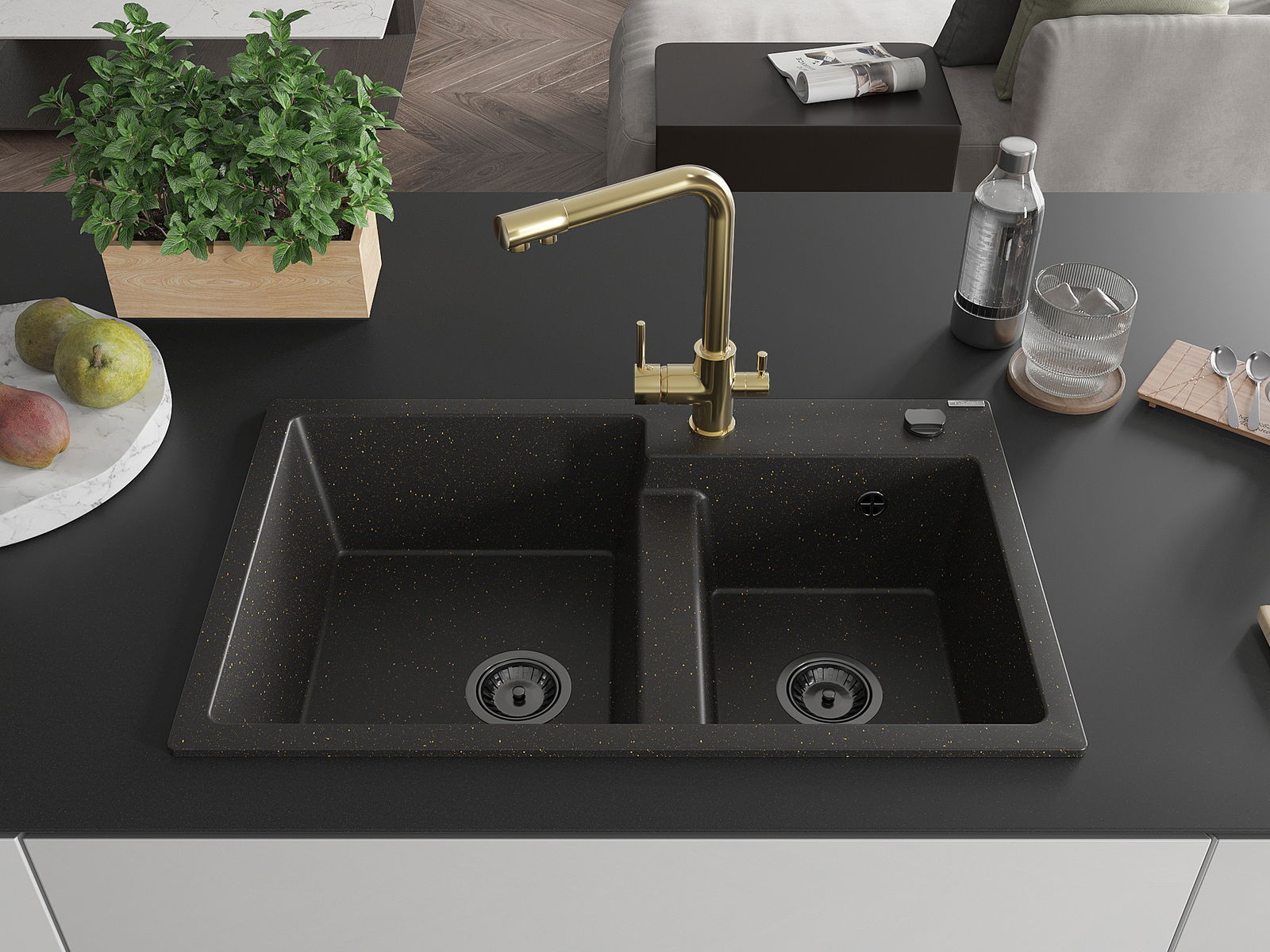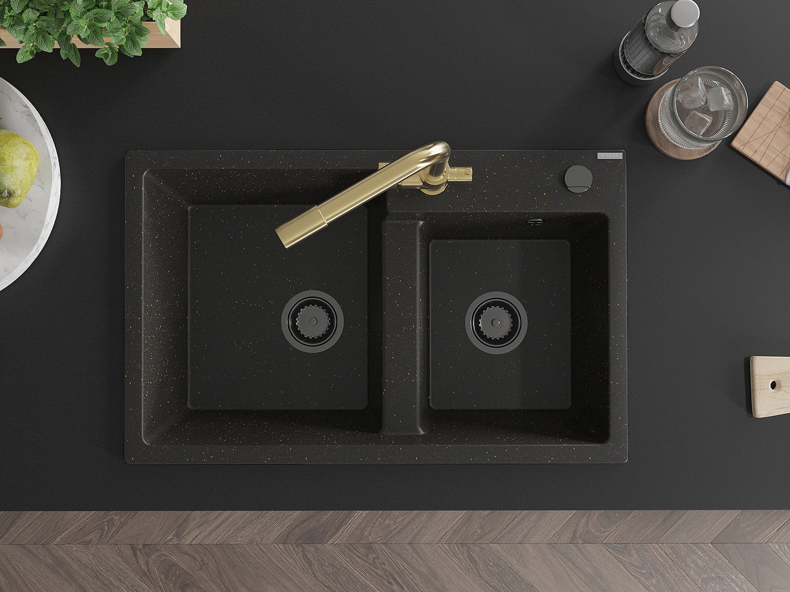 Mexen Tomas granite sink 2-bowl with Duero kitchen tap, black/gold metallic - 6516-75-671600-50-B
