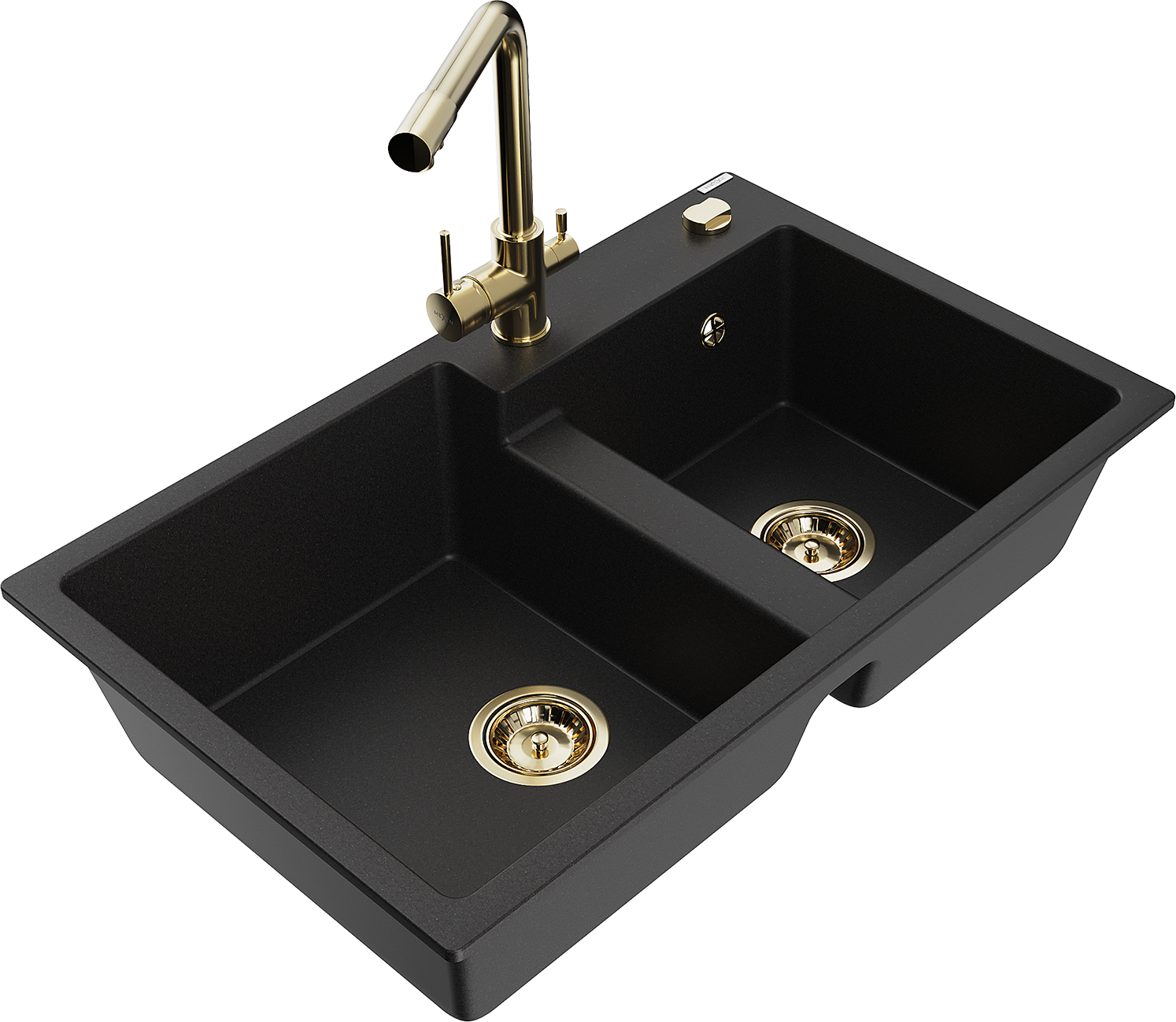 Mexen Tomas granite sink 2-bowl with Duero kitchen tap, black - 6516-77-671600-50