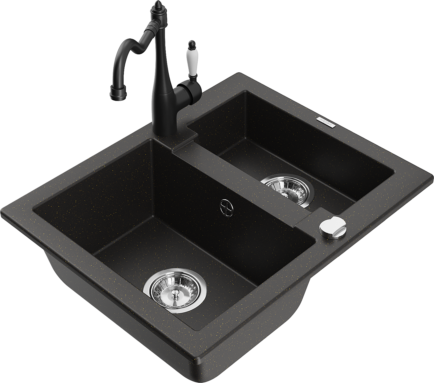 Mexen Carlos granite sink 1.5-bowl with Carla kitchen tap, black/gold metallic - 6518-75-670700-70