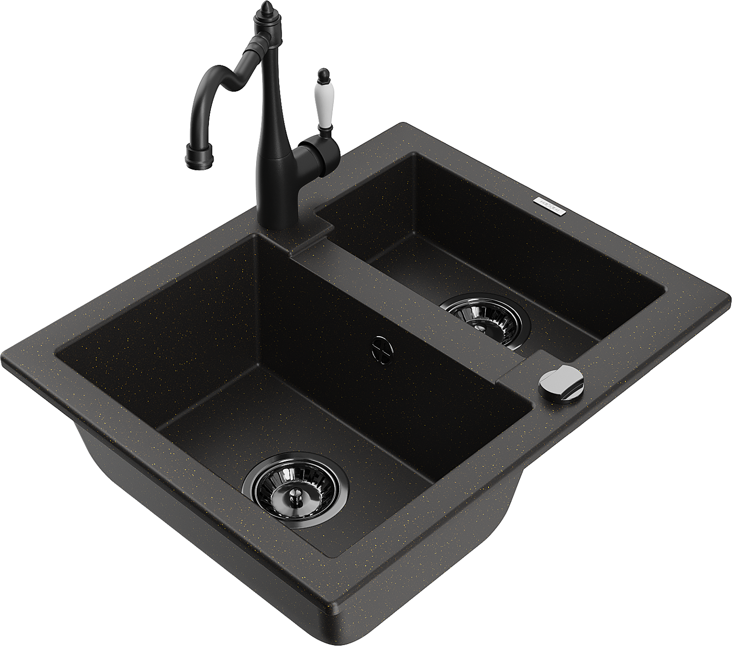 Mexen Carlos 1.5-bowl granite sink with Carla kitchen tap, black/gold metallic - 6518-75-670700-70-B
