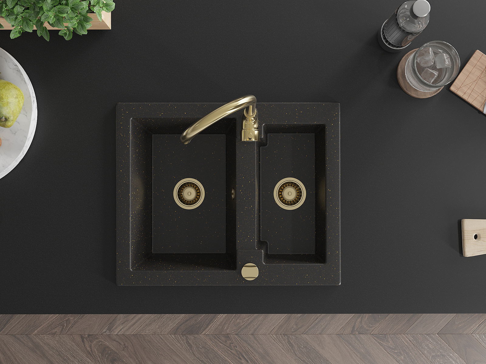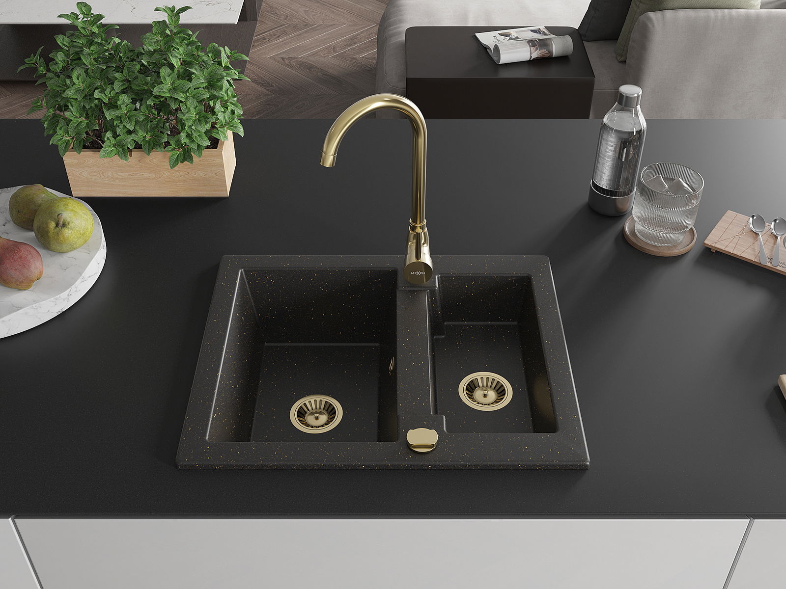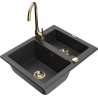 Mexen Carlos 1.5-bowl granite sink with Telma kitchen tap, black/golden metallic - 6518-75-670200-50