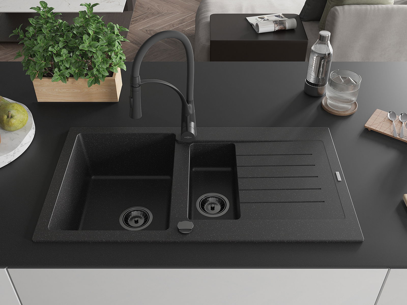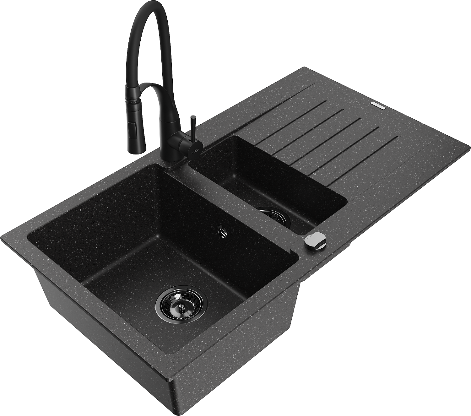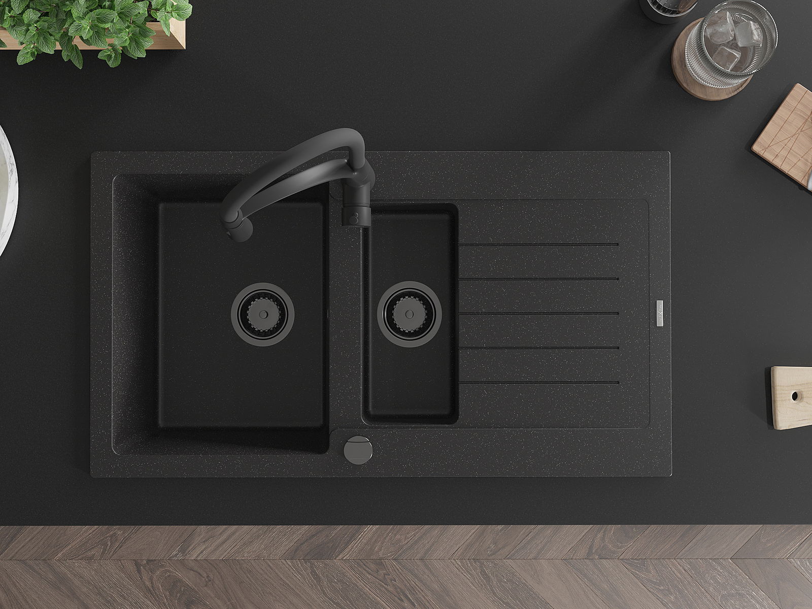 Mexen Matias granite sink 1.5-bowl with drainer and Aster kitchen tap, black/silver - 6502-73-73450-70-B