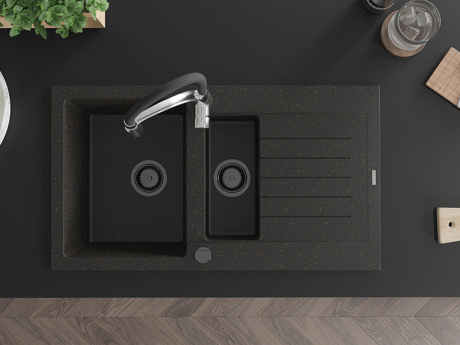 Mexen Matias granite sink 1.5 bowl with drainer and Aster kitchen tap, black/gold metallic - 6502-75-73450-07-B