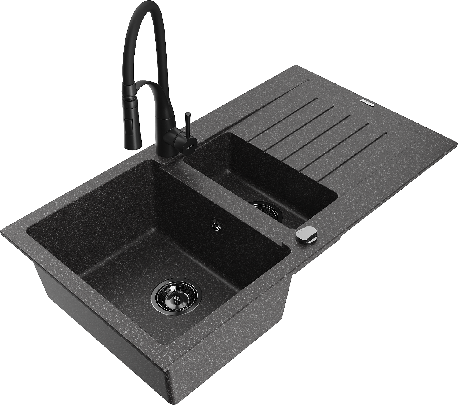 Mexen Matias granite sink 1.5-bowl with drainer and Aster kitchen tap, black speckled - 6502-76-73450-70-B