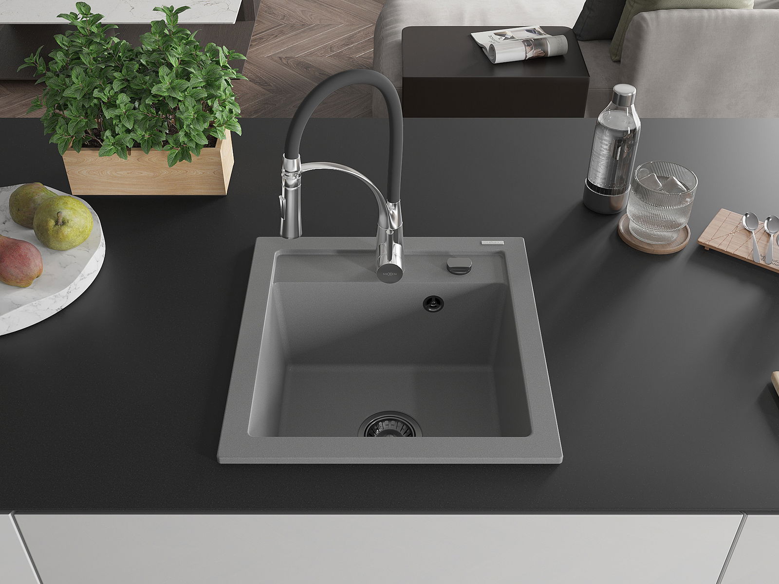 Mexen Vito 1-bowl granite sink with Aster kitchen faucet, grey - 6503-71-73450-07-B