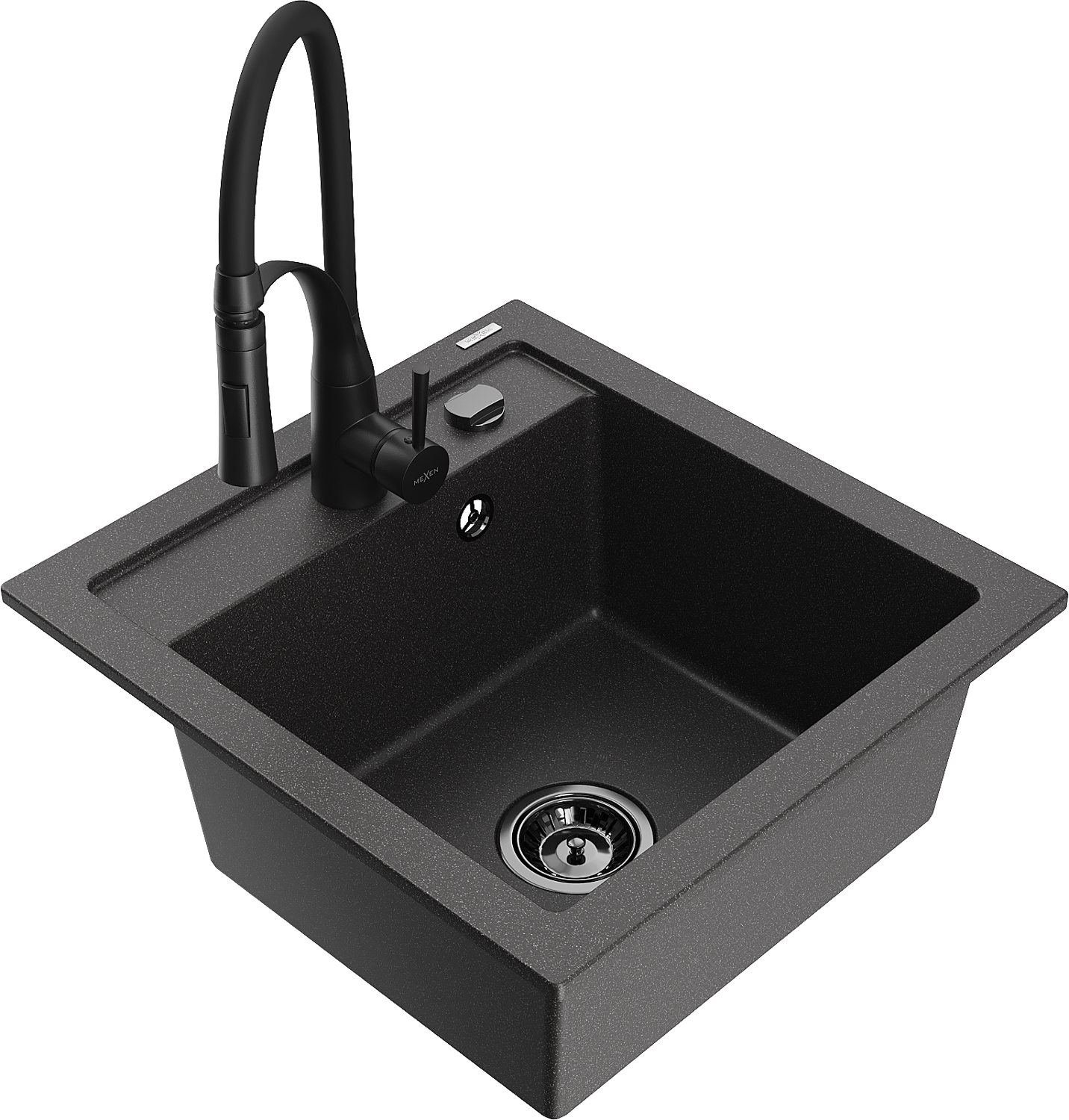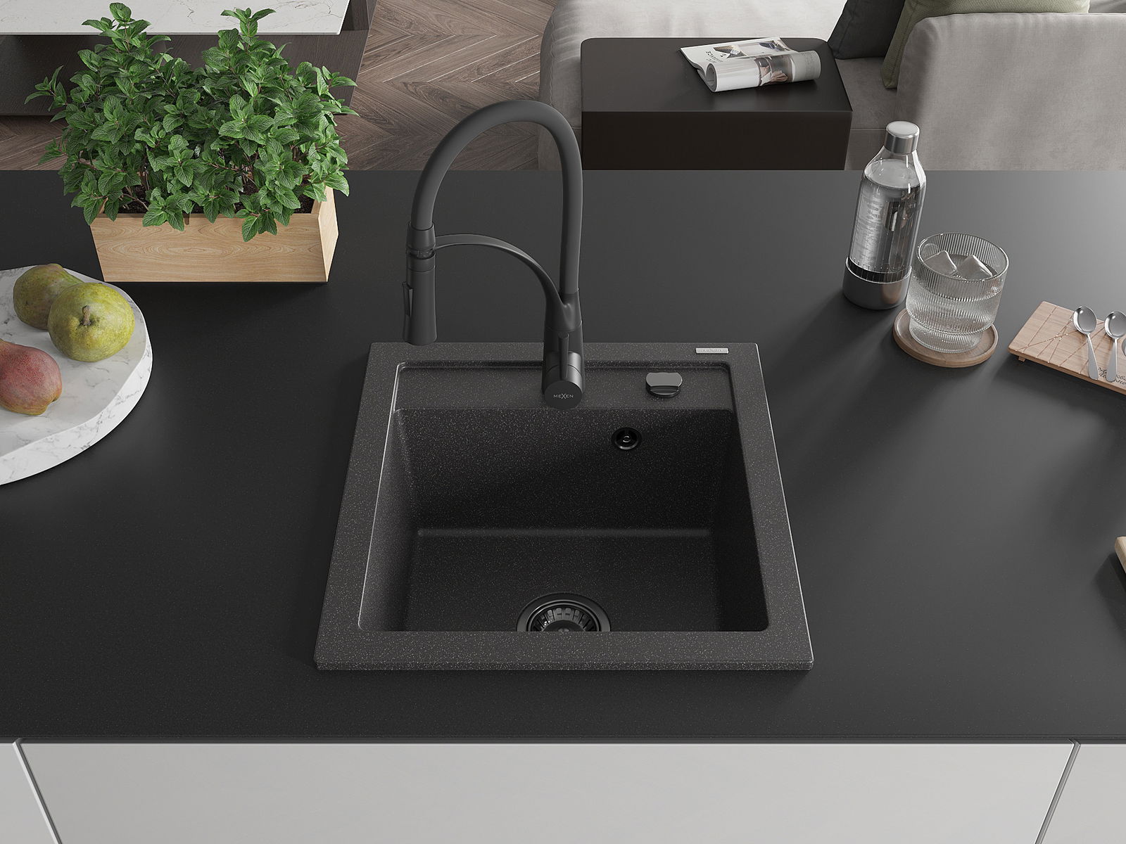 Mexen Vito granite kitchen sink 1-bowl with Aster kitchen tap, black speckled - 6503-76-73450-70-B