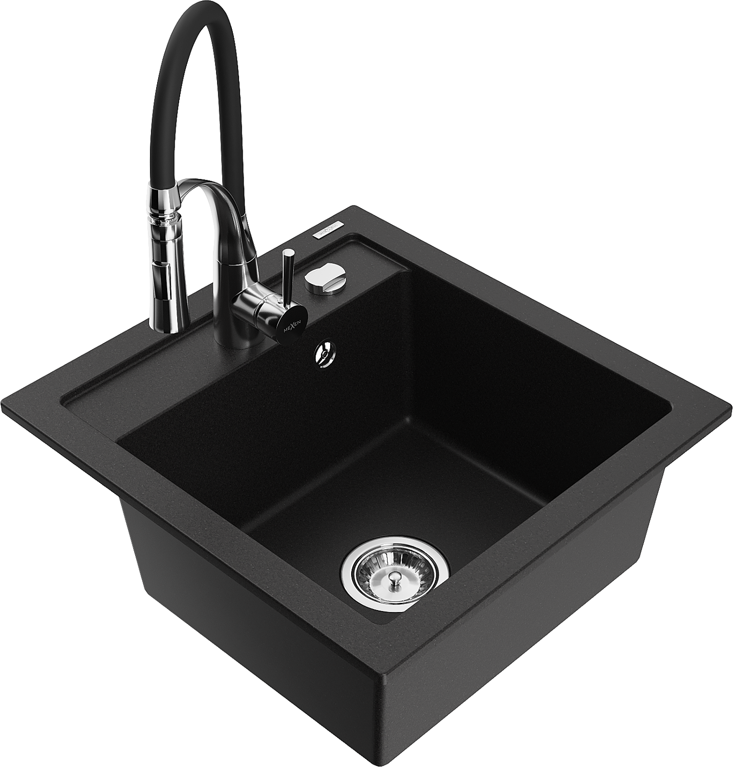 Mexen Vito granite sink 1-bowl with Aster kitchen tap, black - 6503-77-73450-07