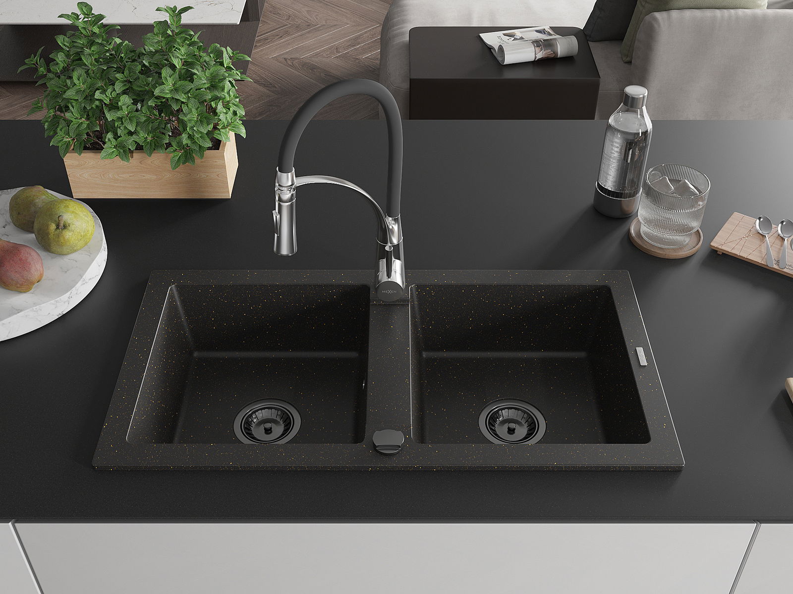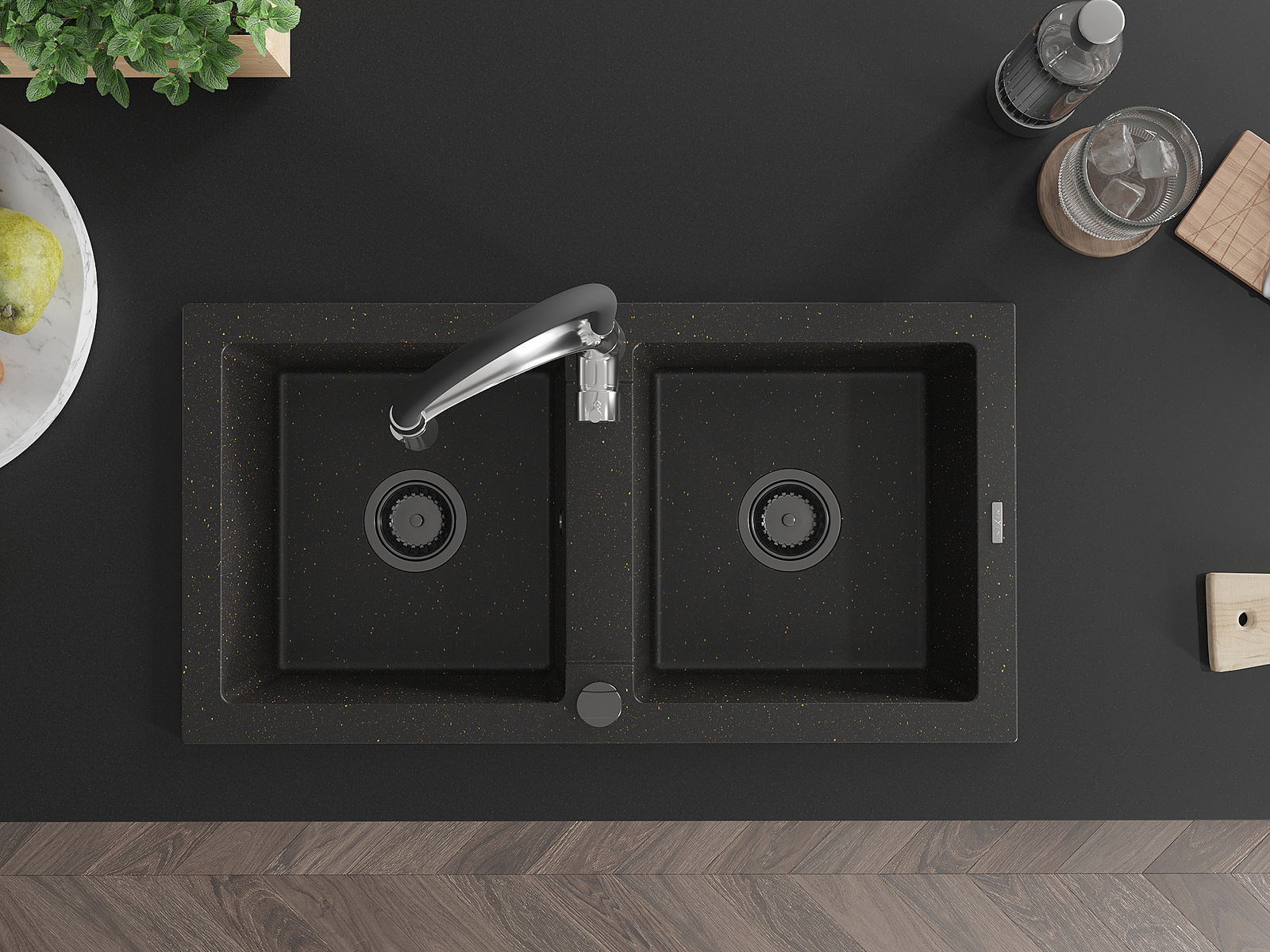 Mexen Mario double granite sink with Aster kitchen tap, black/gold metallic - 6504-75-73450-07-B