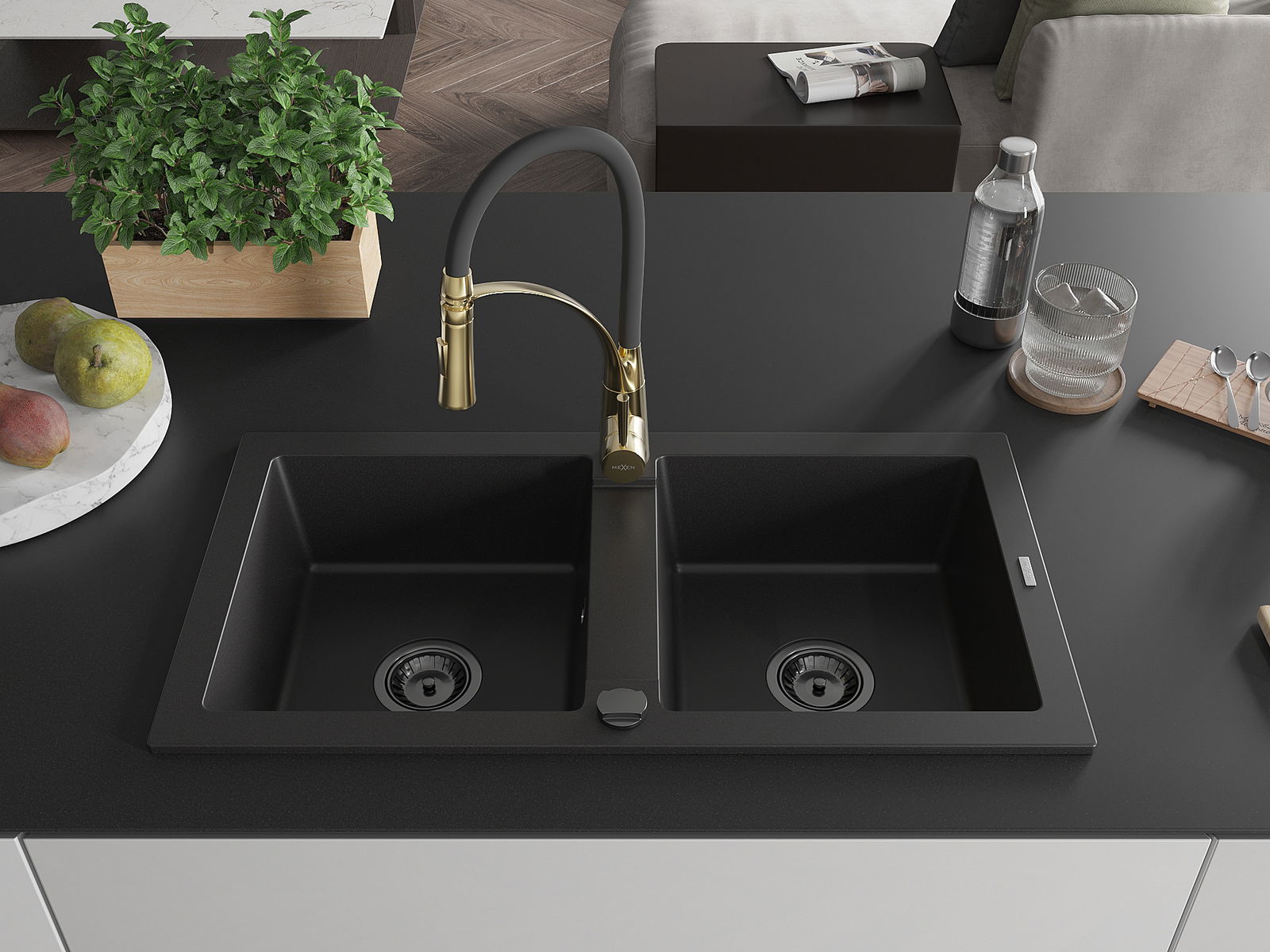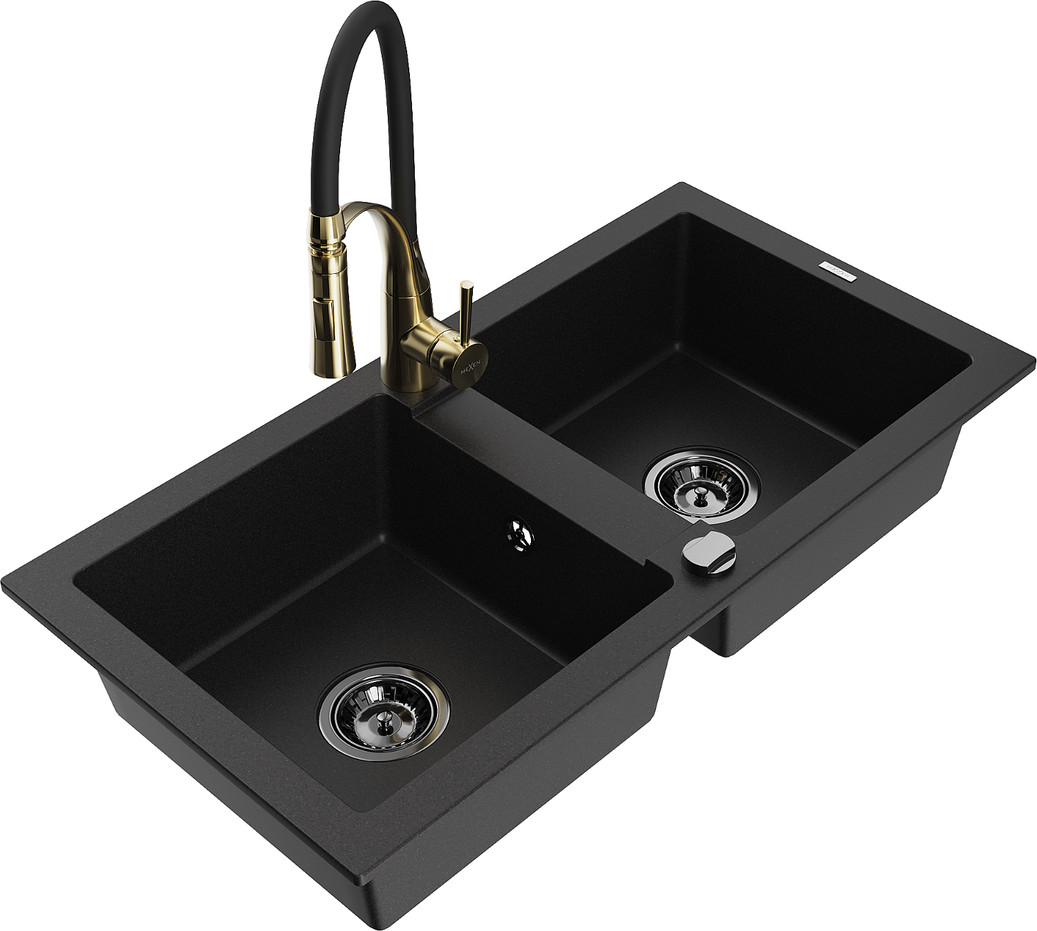 Mexen Mario granite sink with 2 compartments and Aster kitchen tap, black - 6504-77-73450-57-B