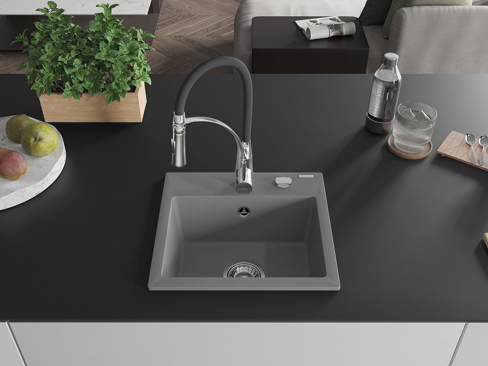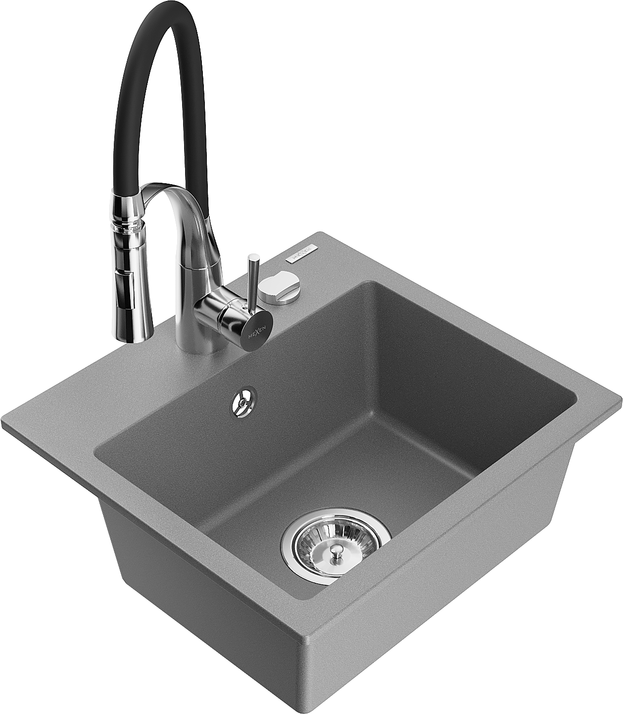 Mexen Milo granite sink 1-bowl with Aster kitchen tap, grey - 6505-71-73450-07