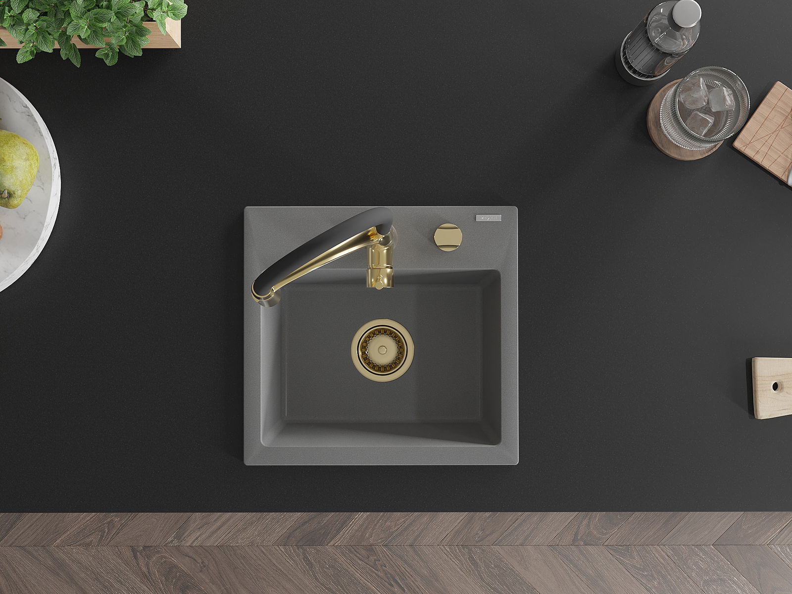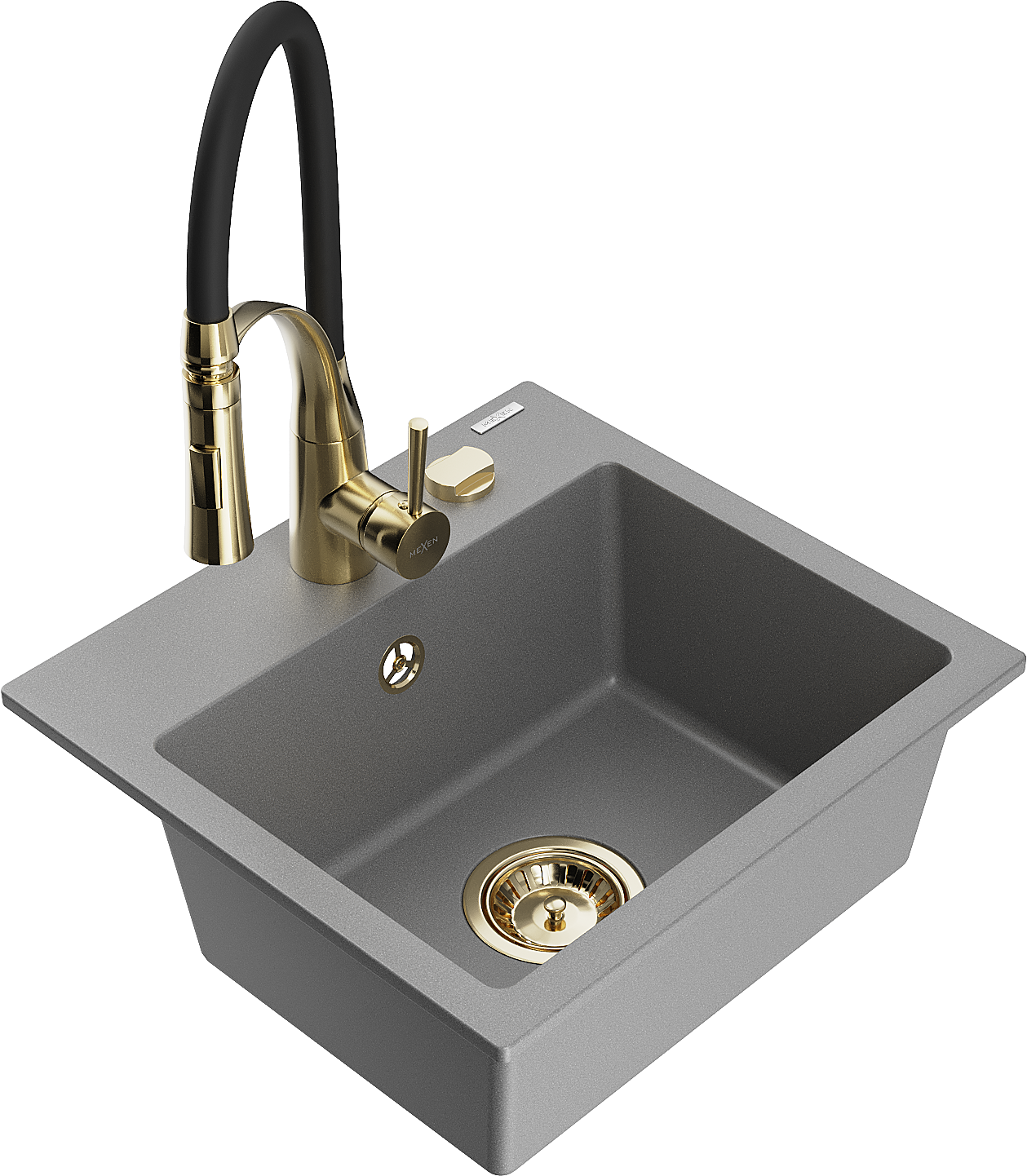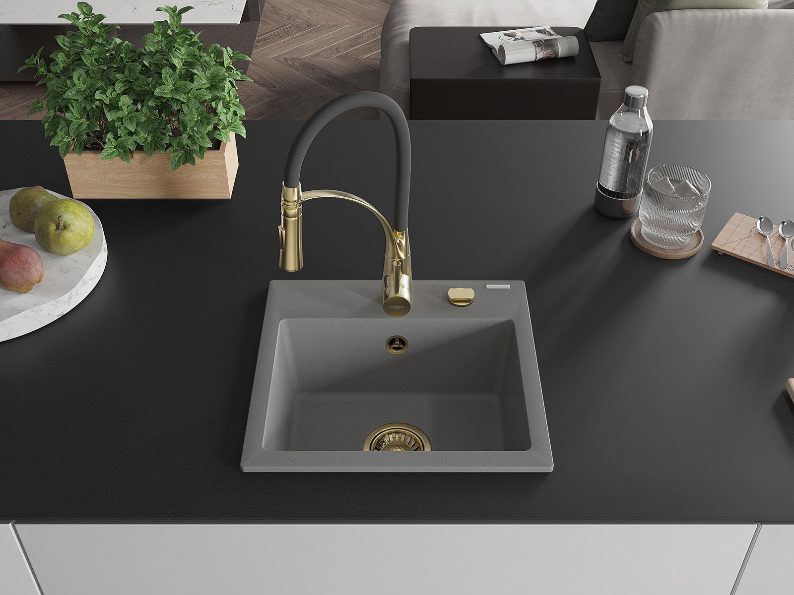 Mexen Milo granite sink 1-bowl with Aster kitchen tap, grey - 6505-71-73450-57-G