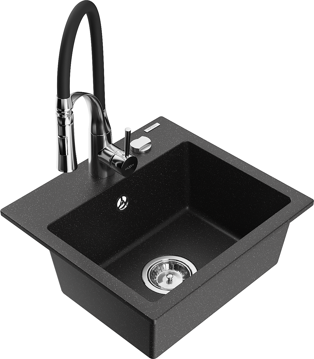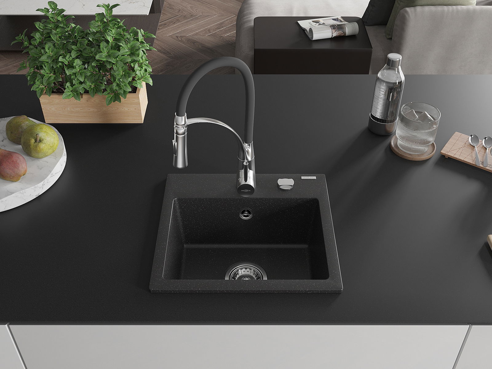 Mexen Milo 1-bowl granite sink with Aster kitchen tap, black/silver metallic - 6505-73-73450-07