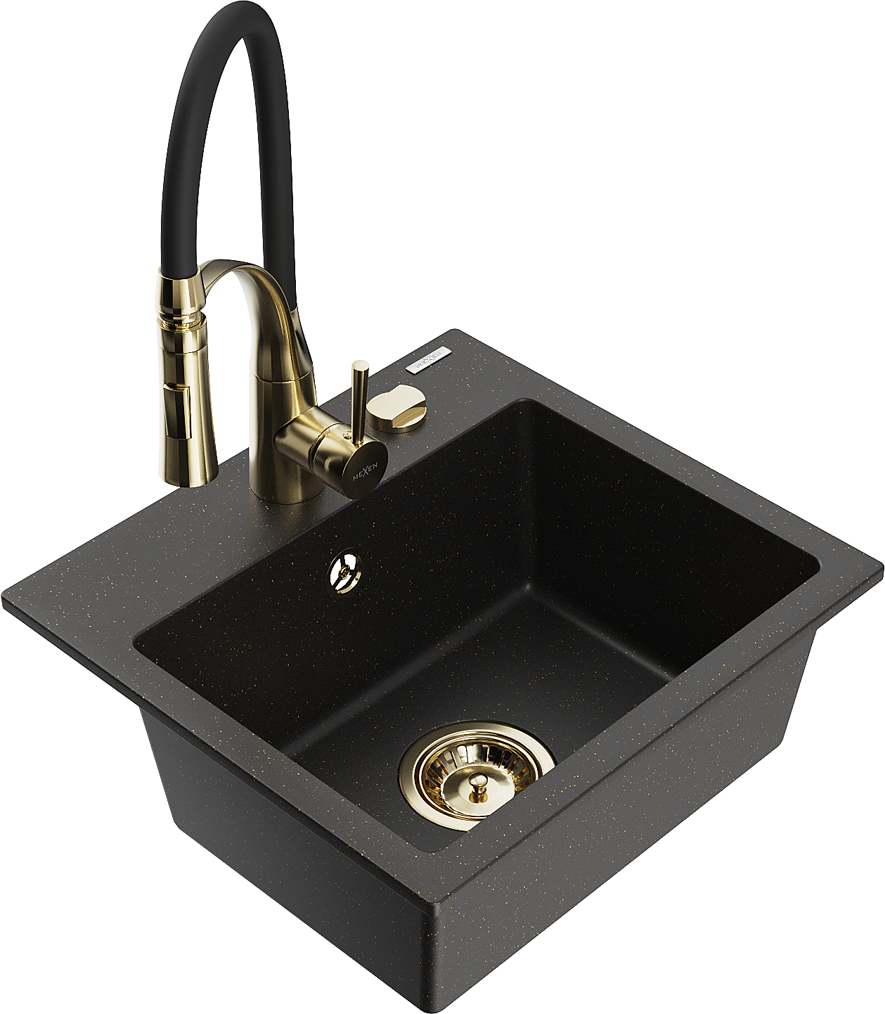Mexen Milo Granite Sink 1-Bowl with Kitchen Tap Aster, Black/Gold Metallic - 6505-75-73450-57-G