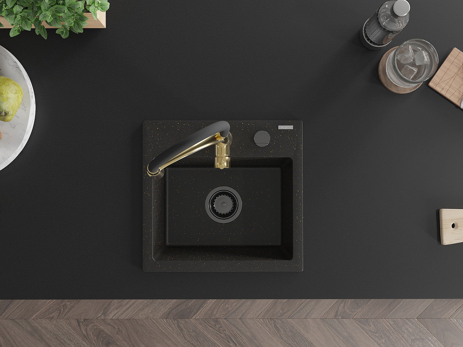 Mexen Milo granite kitchen sink 1-bowl with Aster kitchen tap, black/gold metallic - 6505-75-73450-57-B