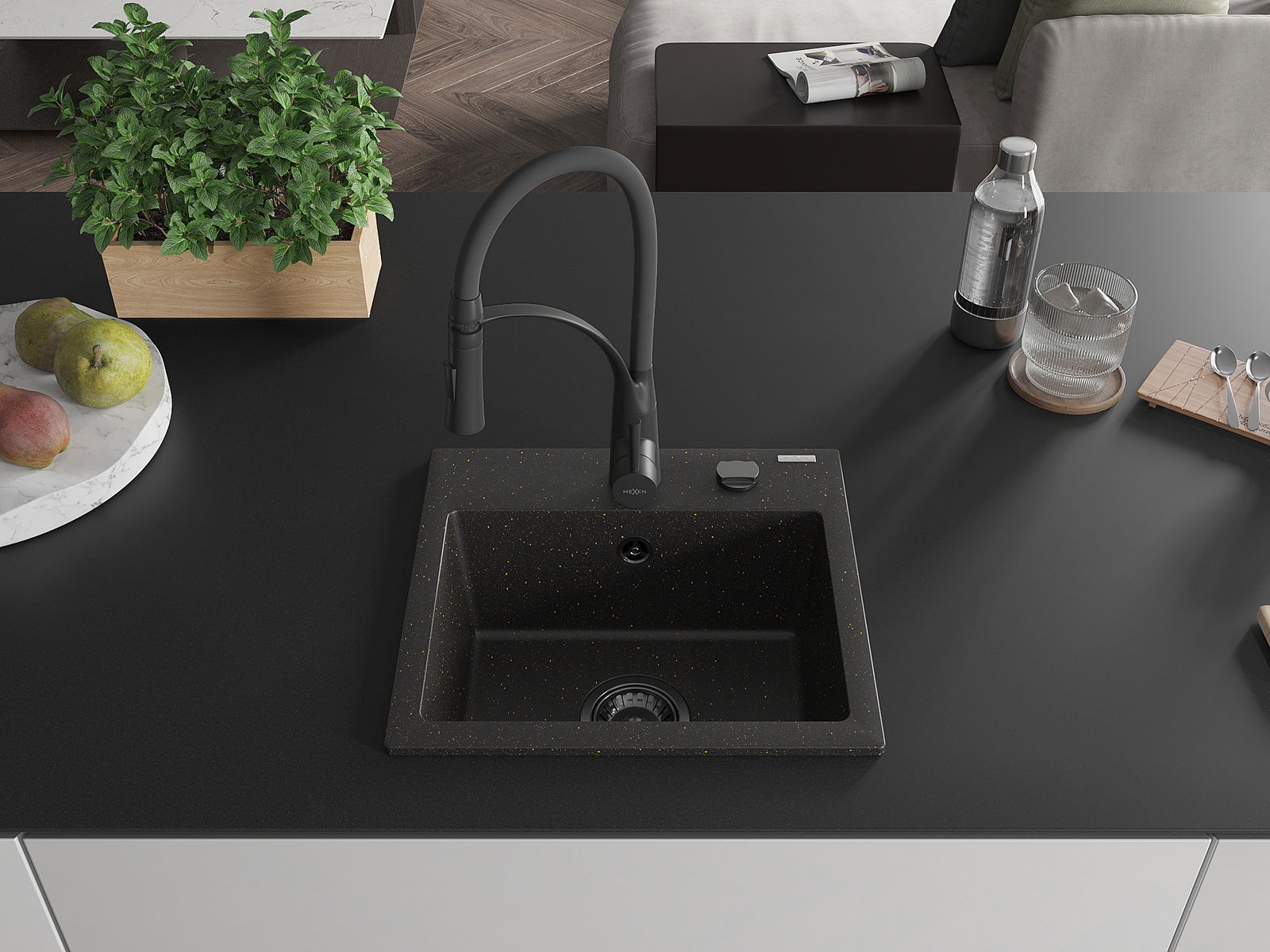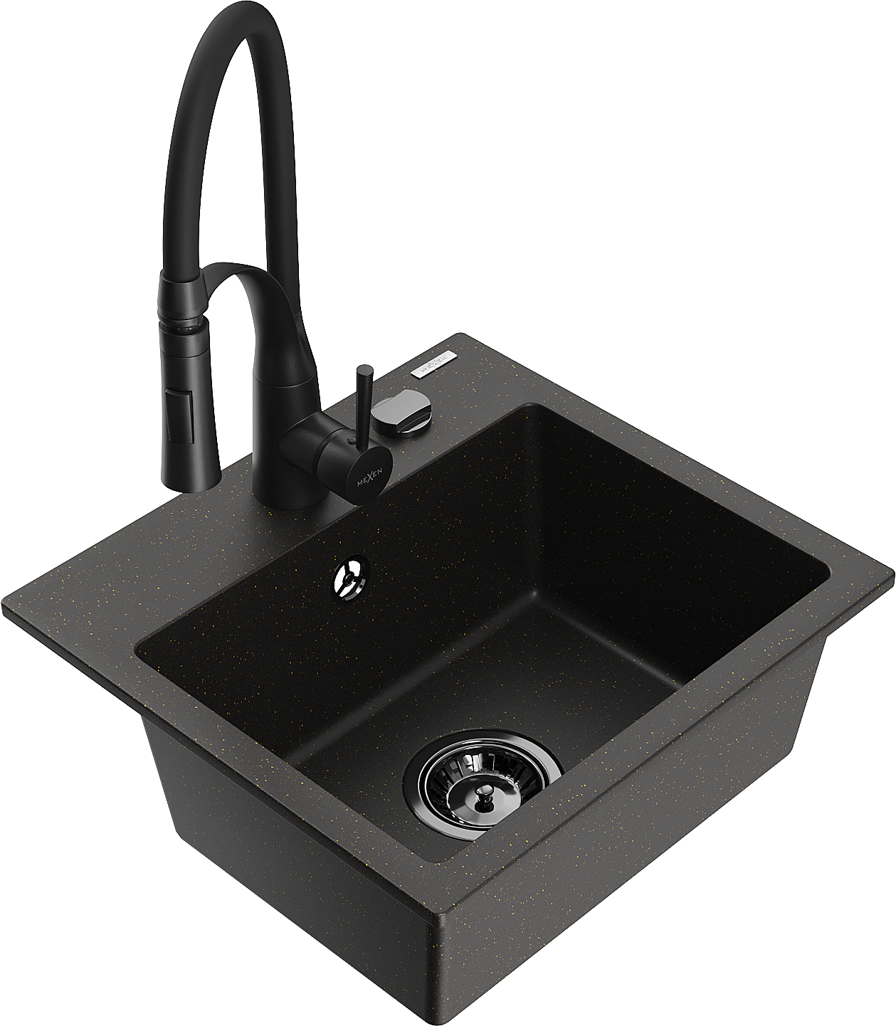 Mexen Milo granite kitchen sink 1-bowl with Aster kitchen tap, black/golden metallic - 6505-75-73450-70-B