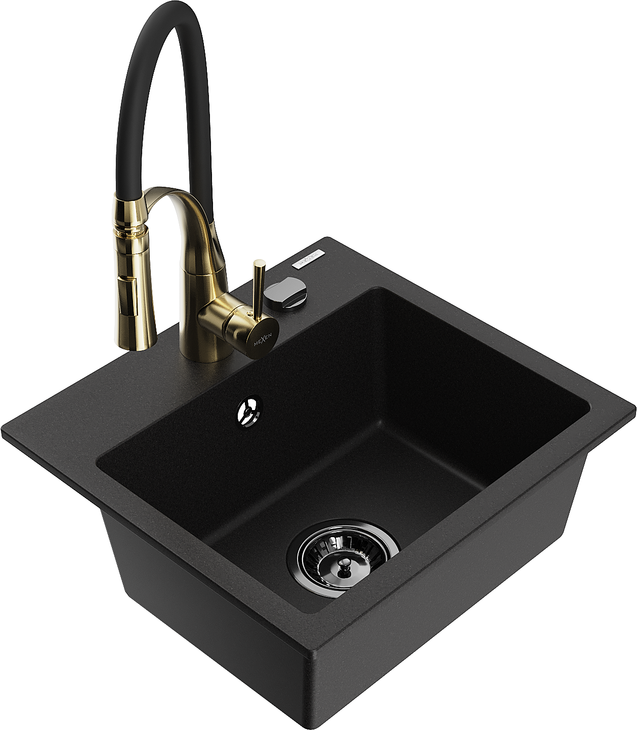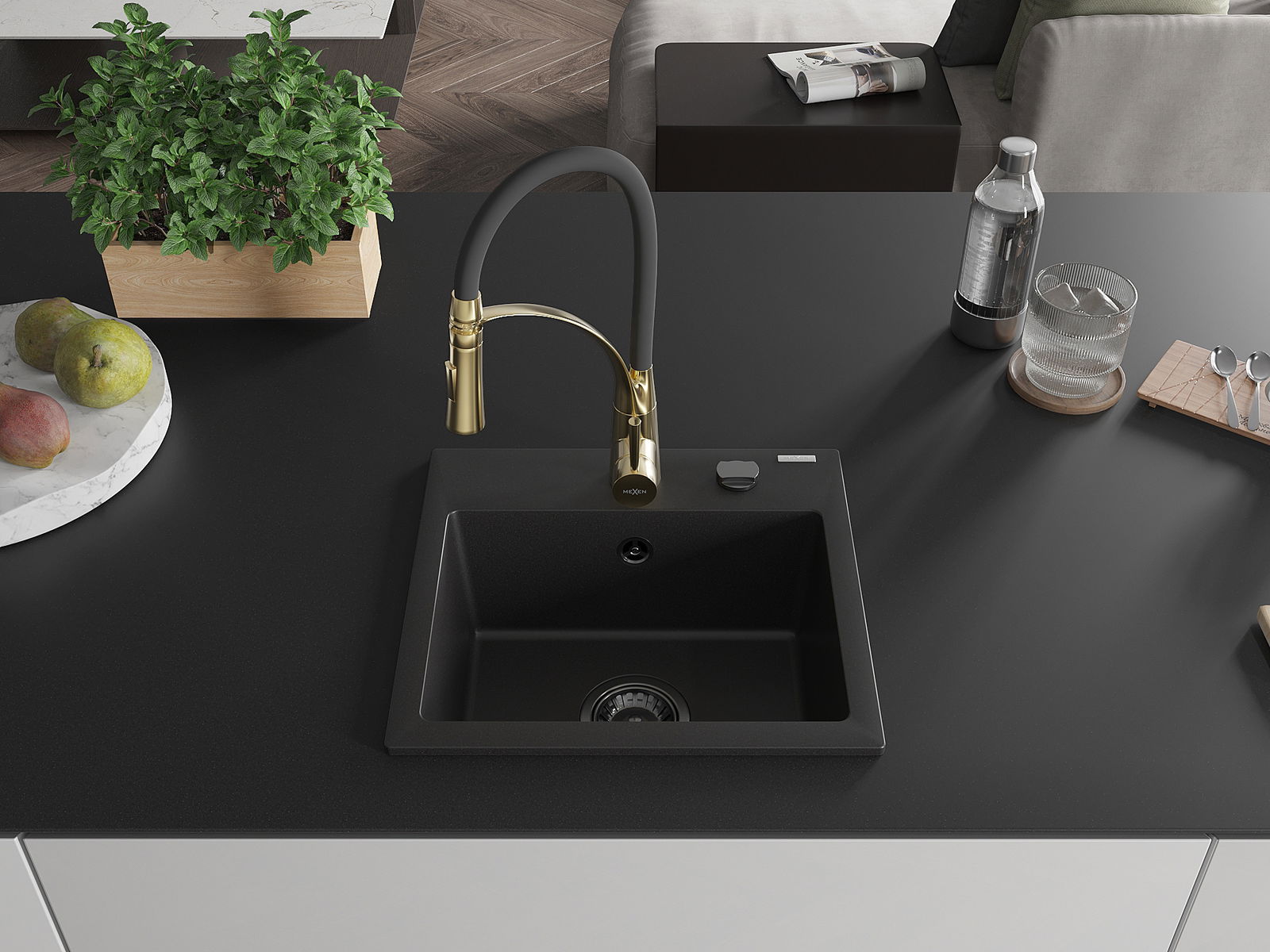 Mexen Milo 1-bowl granite sink with Aster kitchen tap, black - 6505-77-73450-57-B