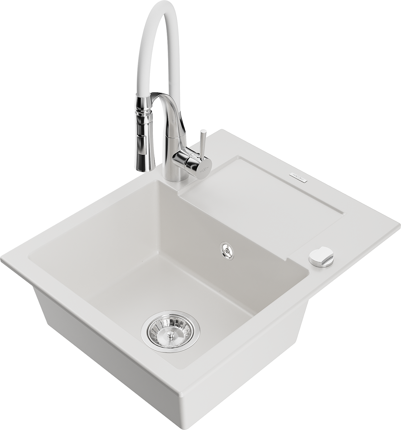 Mexen Enzo single-bowl granite sink with drainer and Aster kitchen tap, white - 6506-20-73450-02