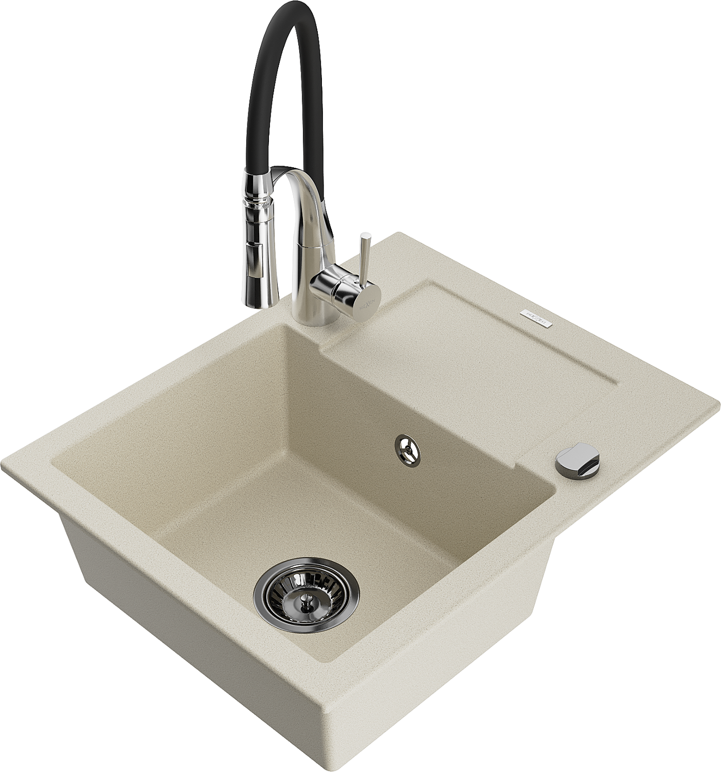 Mexen Enzo 1-bowl granite sink with drainer and Aster kitchen tap, beige - 6506-69-73450-07-B