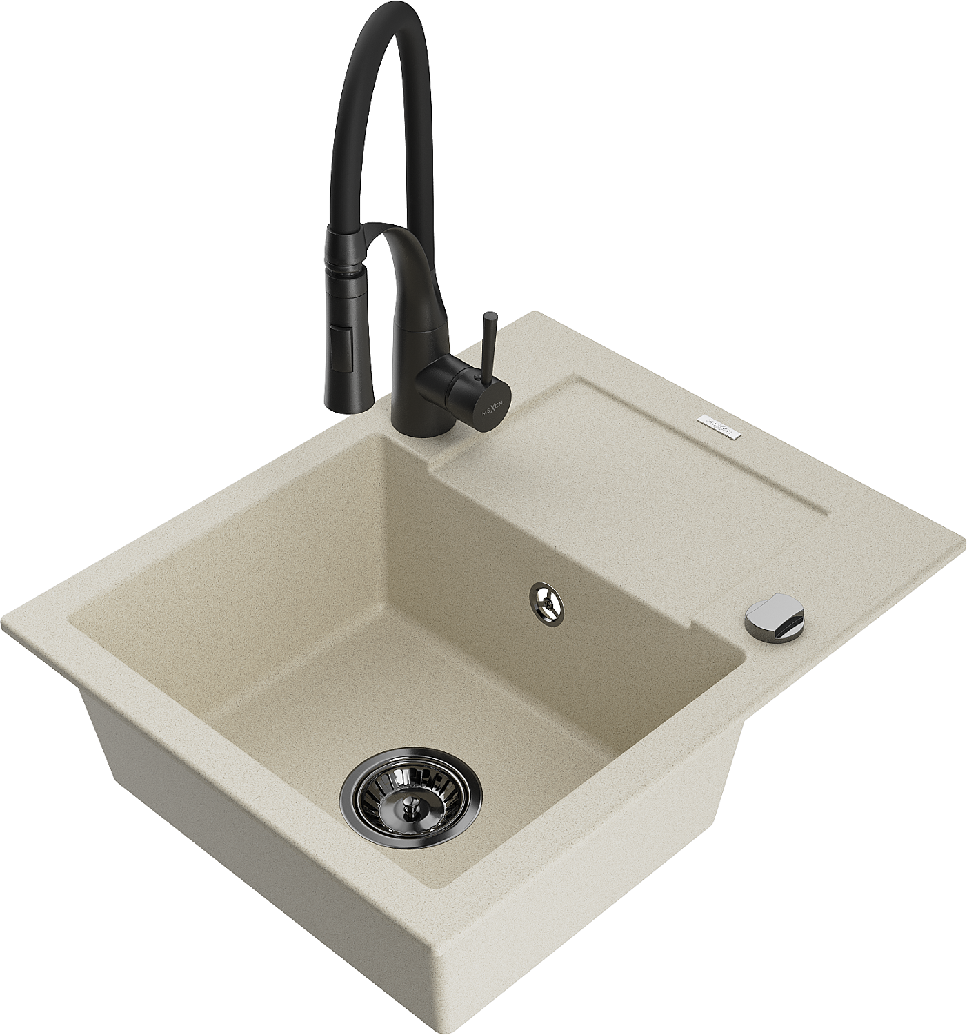 Mexen Enzo 1-bowl granite sink with drainer and Aster kitchen tap, beige - 6506-69-73450-70-B