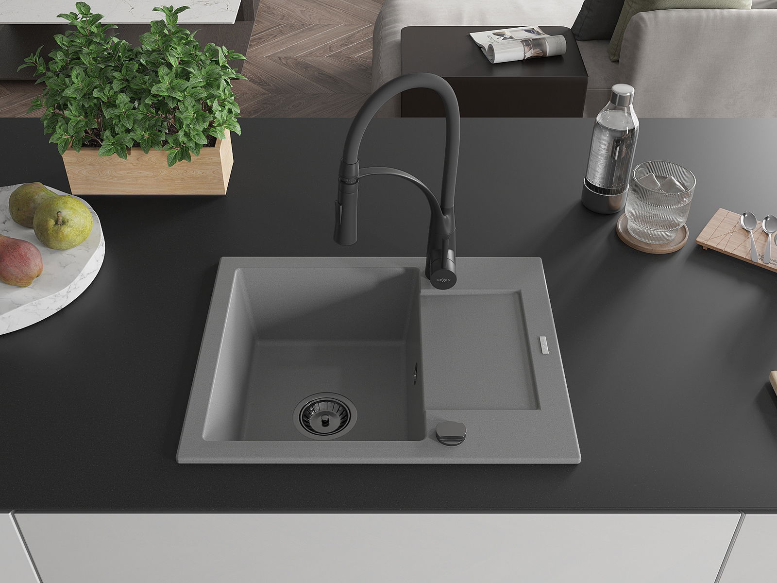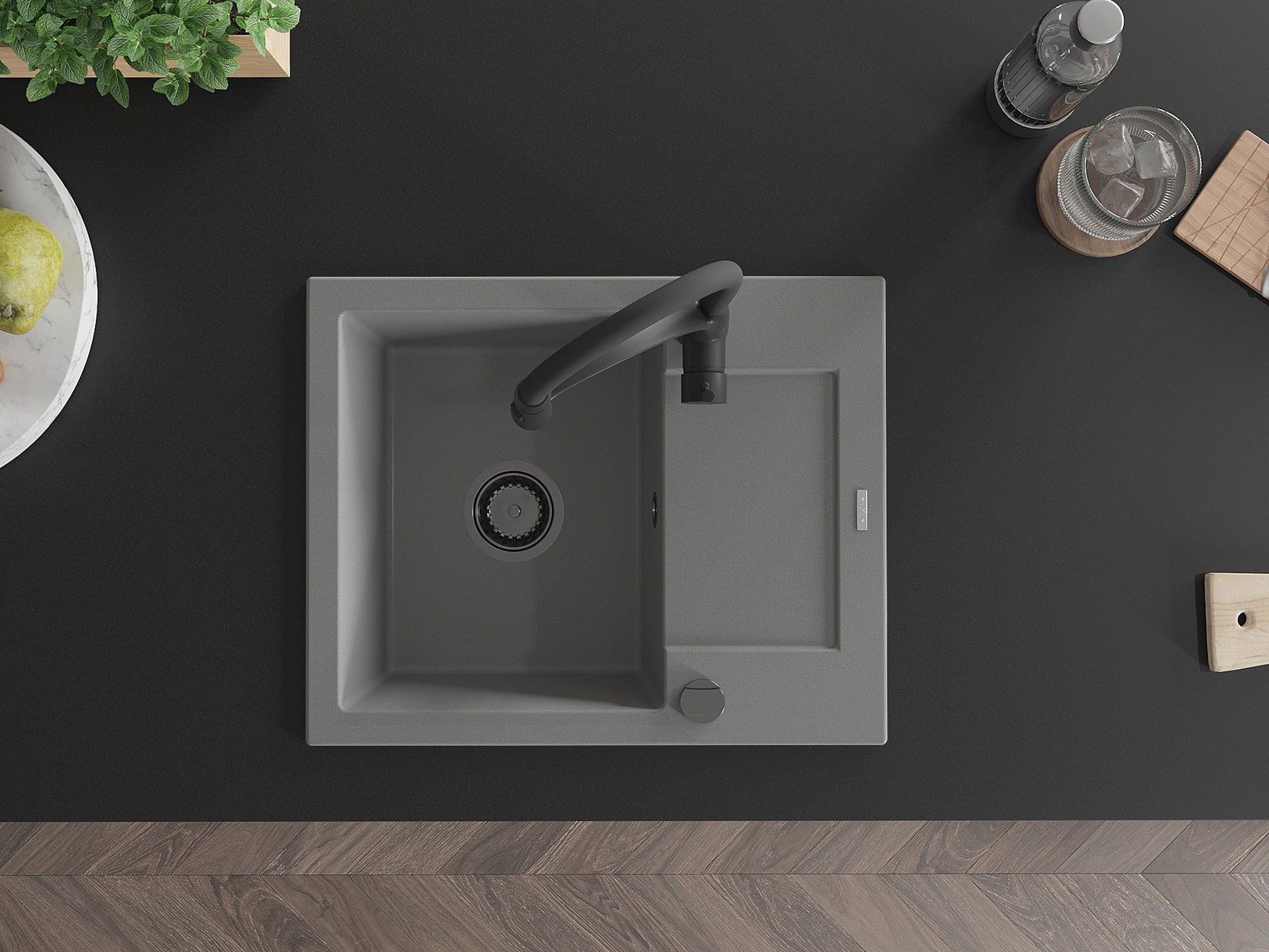 Mexen Enzo granite sink 1-bowl with drainer and Aster kitchen tap, grey - 6506-71-73450-70-B