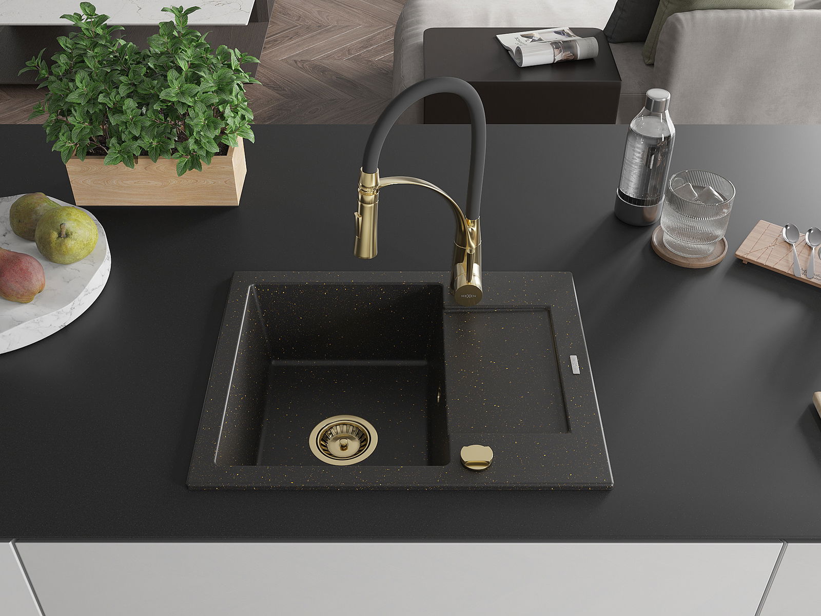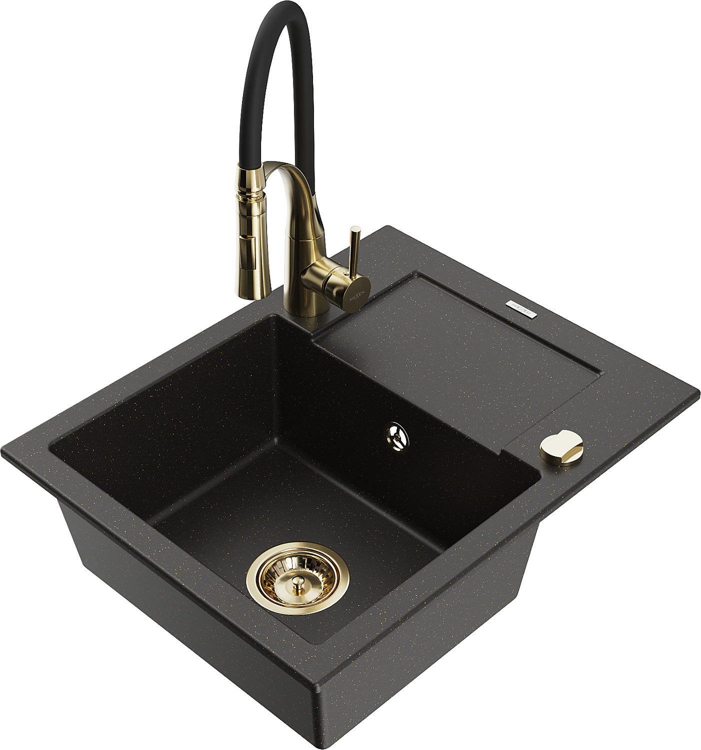 Mexen Enzo granite sink 1-bowl with drainer and Aster kitchen tap, black/gold metallic - 6506-75-73450-57-G