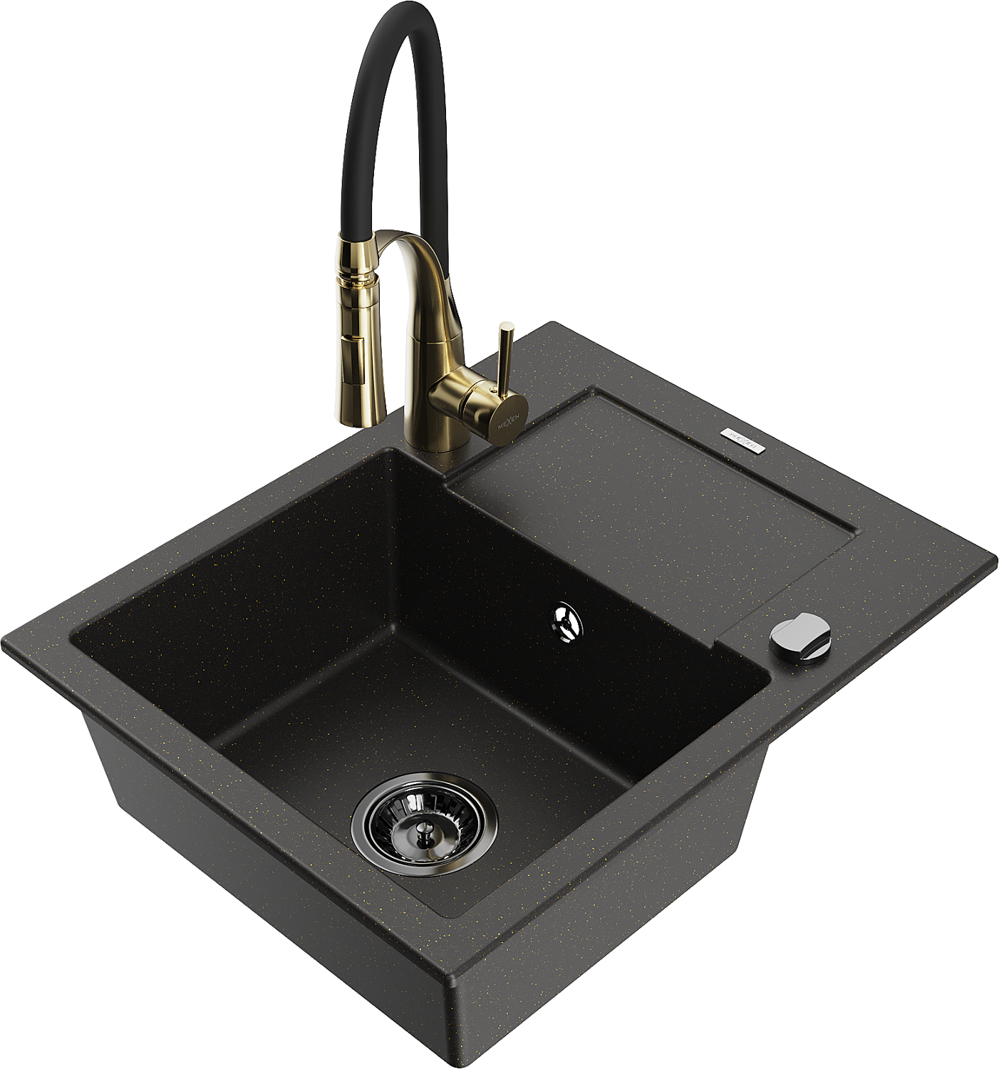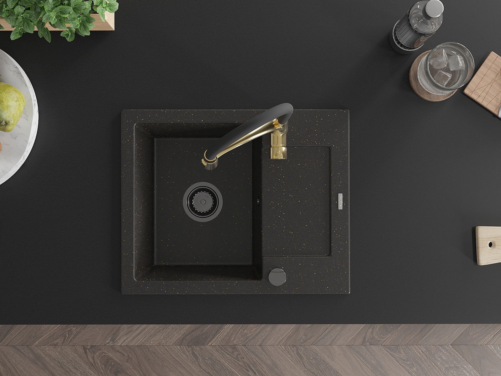 Mexen Enzo 1-bowl Granite Sink with Drainer and Aster Kitchen Tap, Black/Gold Metallic - 6506-75-73450-57-B