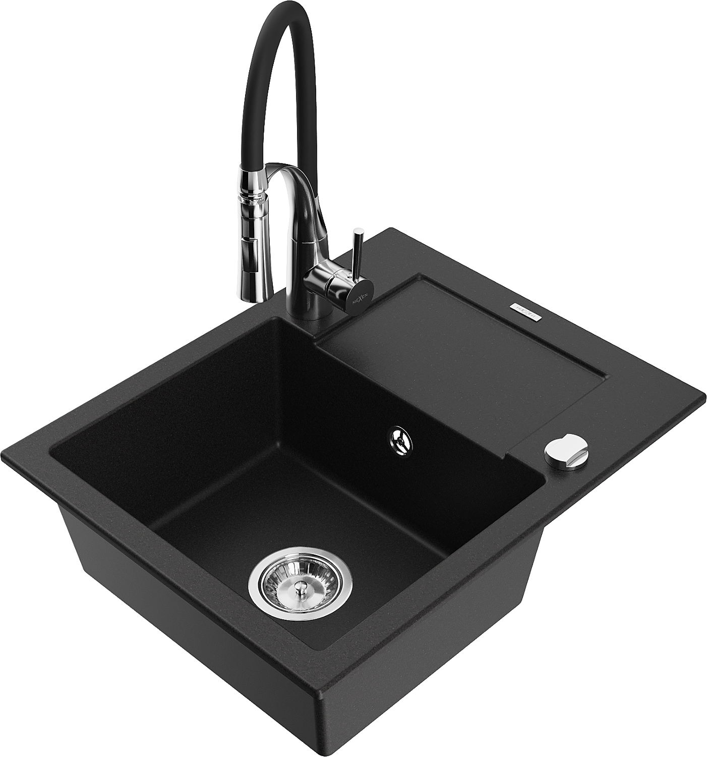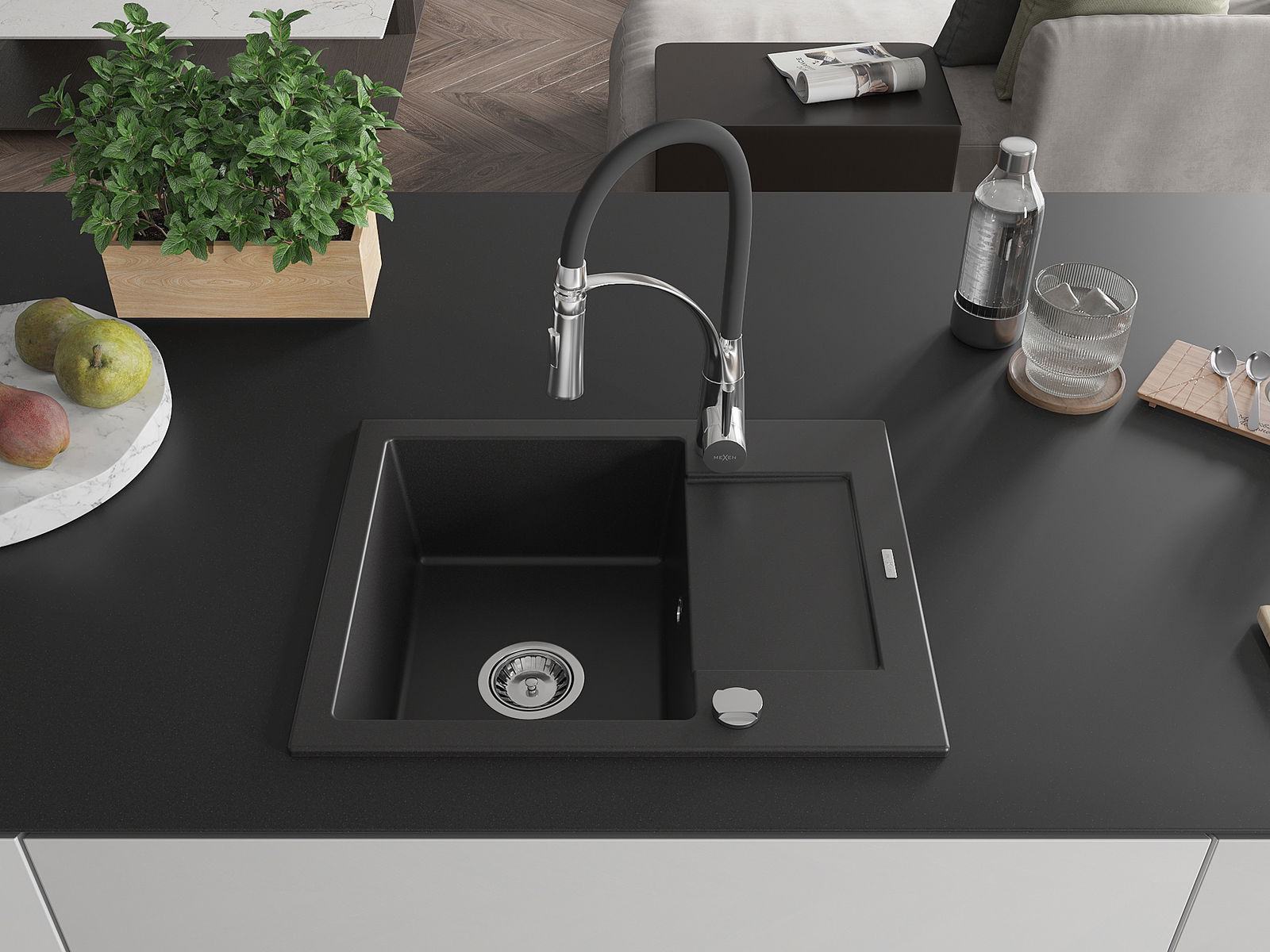 Mexen Enzo Granite 1-Bowl Sink with Drainer and Aster Kitchen Tap, Black - 6506-77-73450-07