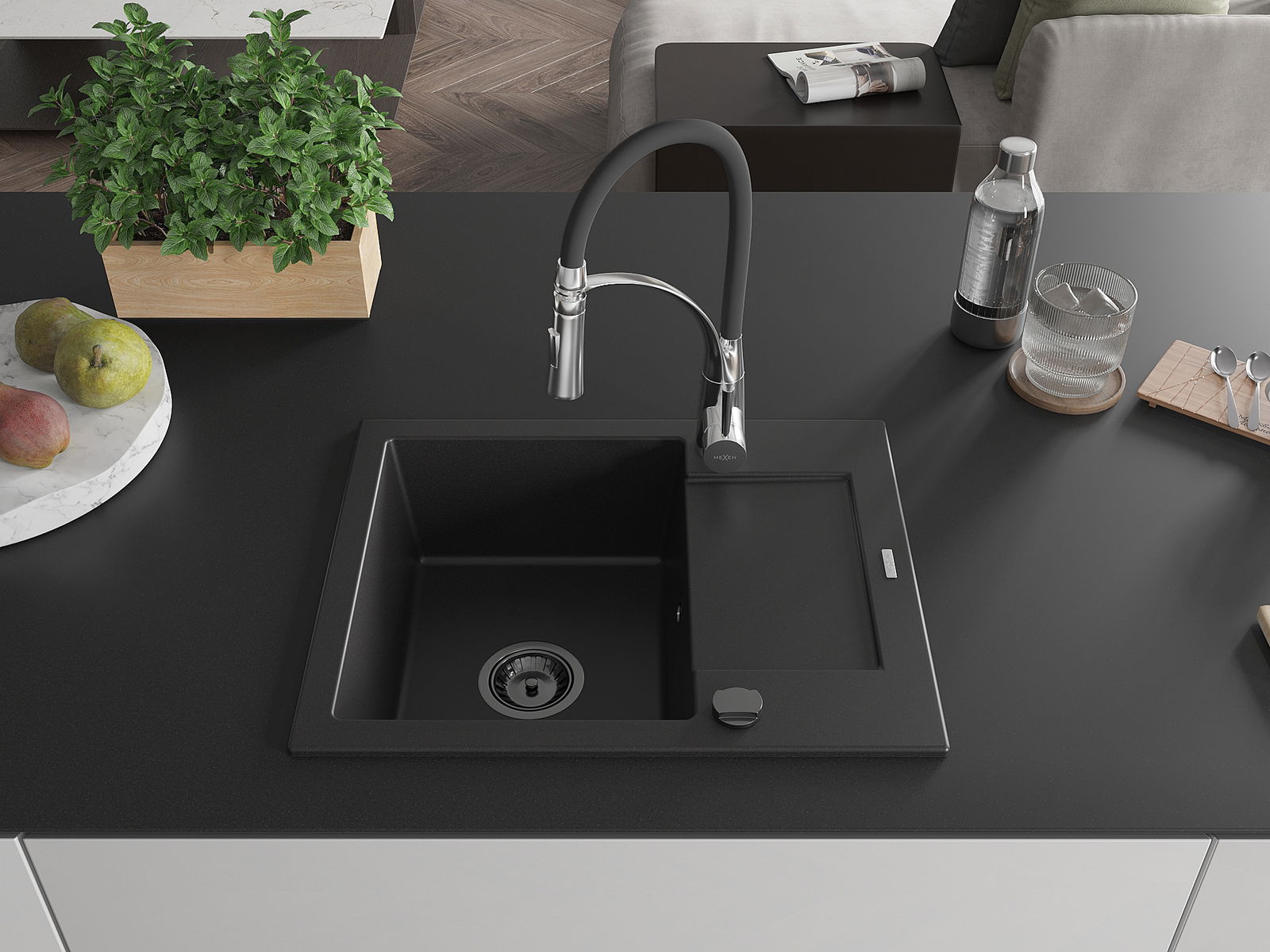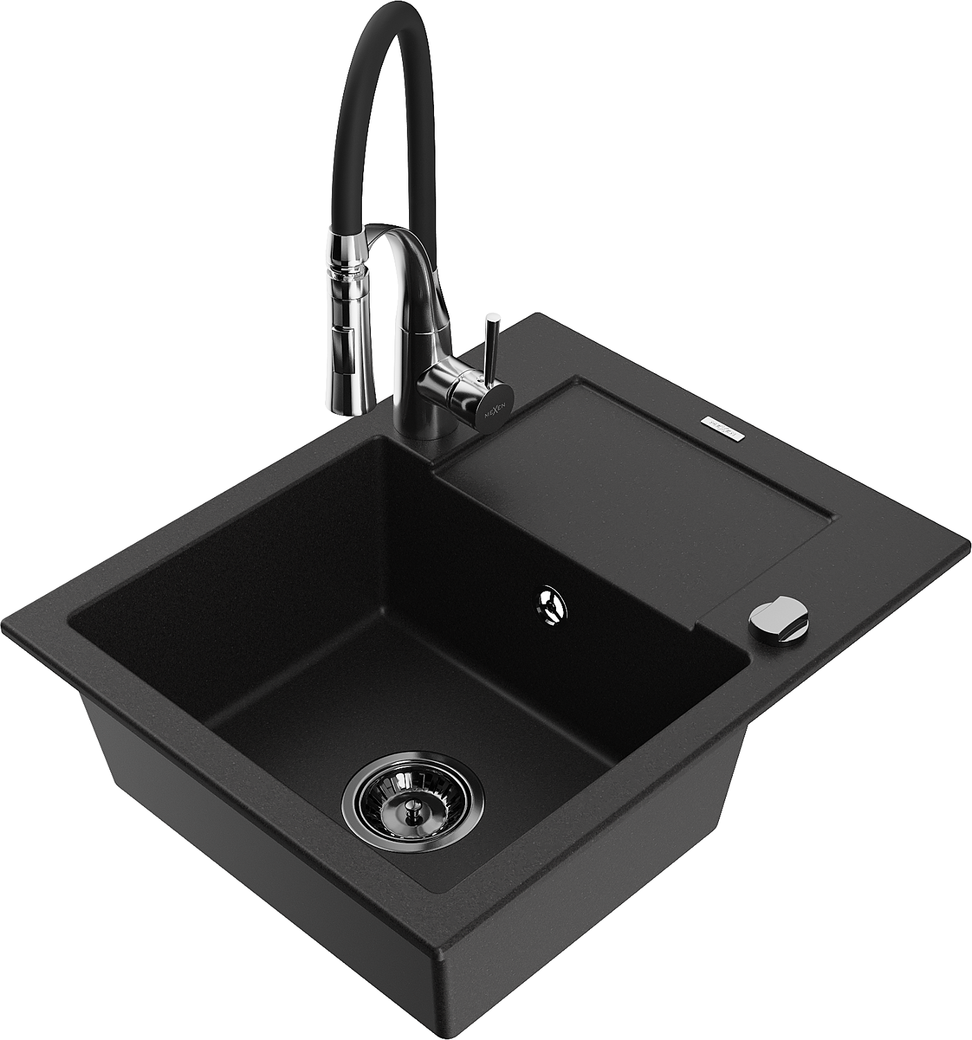Mexen Enzo granite sink 1-bowl with drainer and Aster kitchen tap, black - 6506-77-73450-07-B