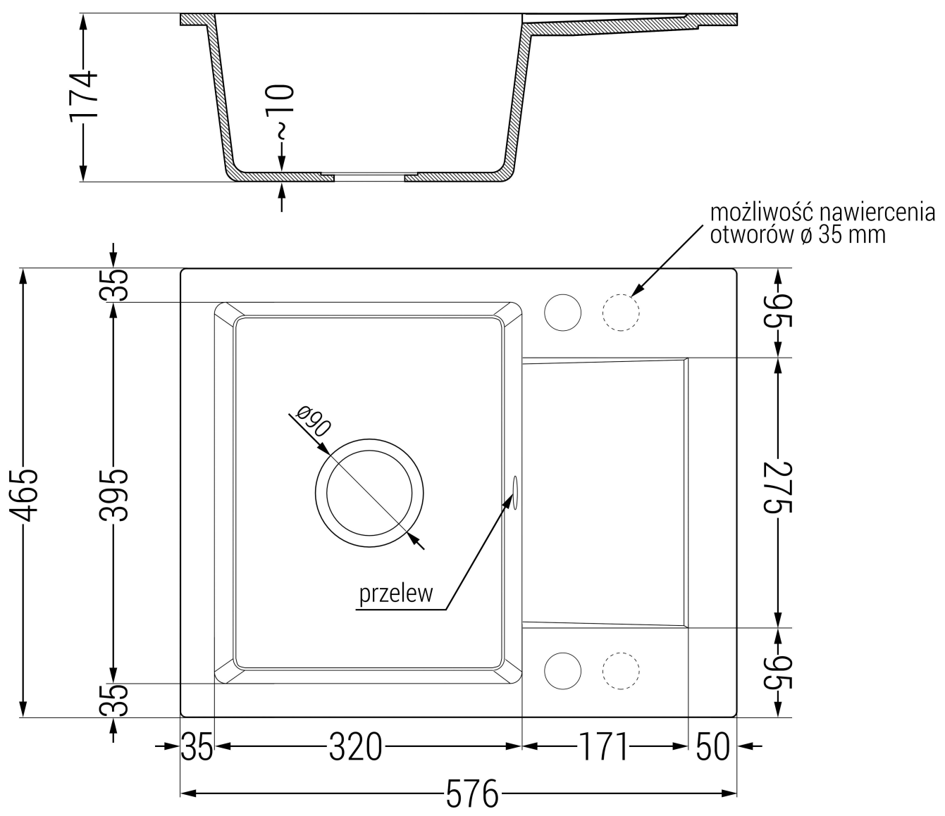 The sink has 2 pre-drilled holes with a diameter of 35 mm that can be knocked out independently. They can be used, for example, to install a soap dispenser, eliminating the need for plastic bottles in the kitchen and giving it an elegant finish.