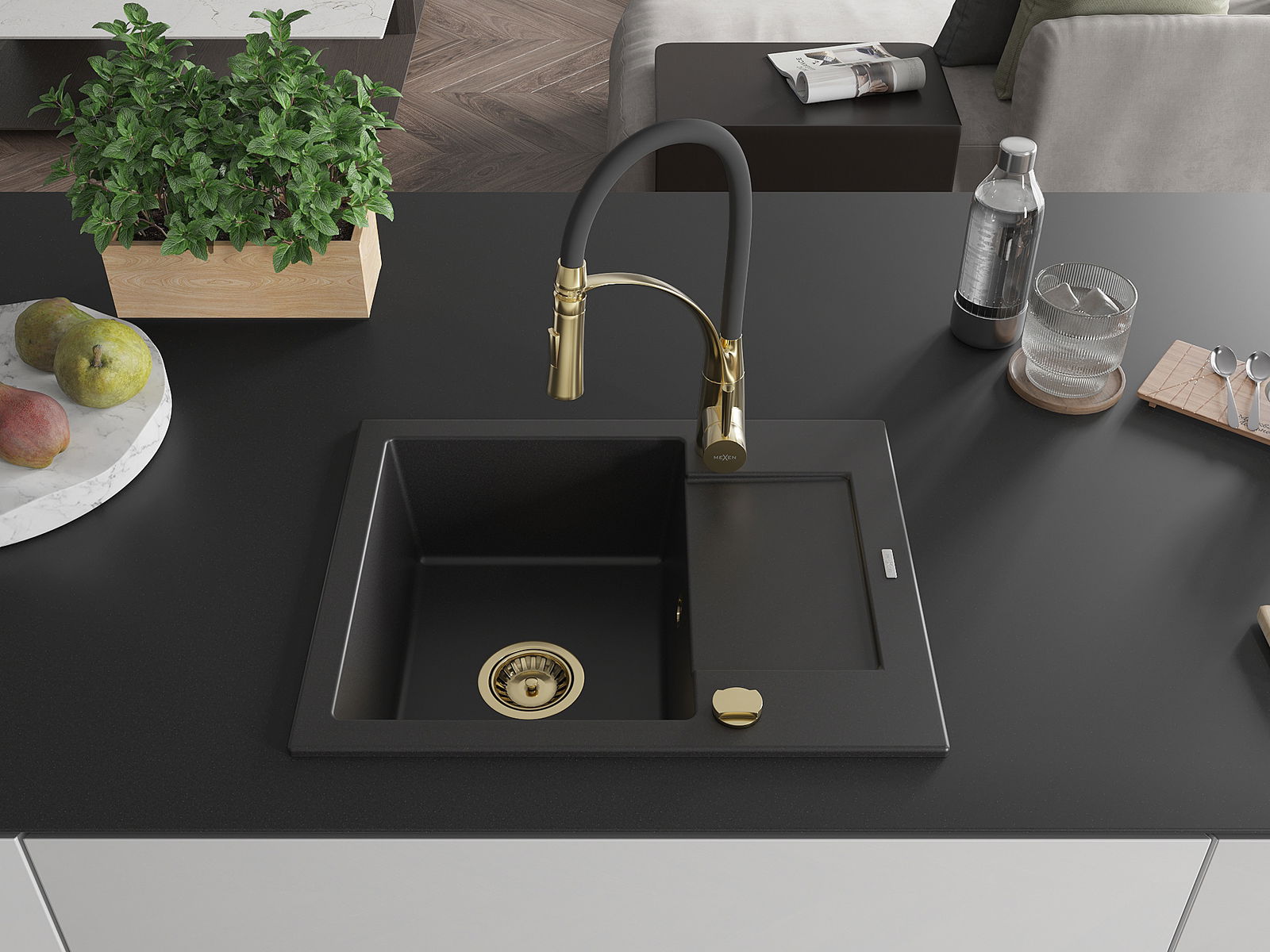 Mexen Enzo granite sink 1-bowl with drainer and Aster kitchen tap, black - 6506-77-73450-57-G