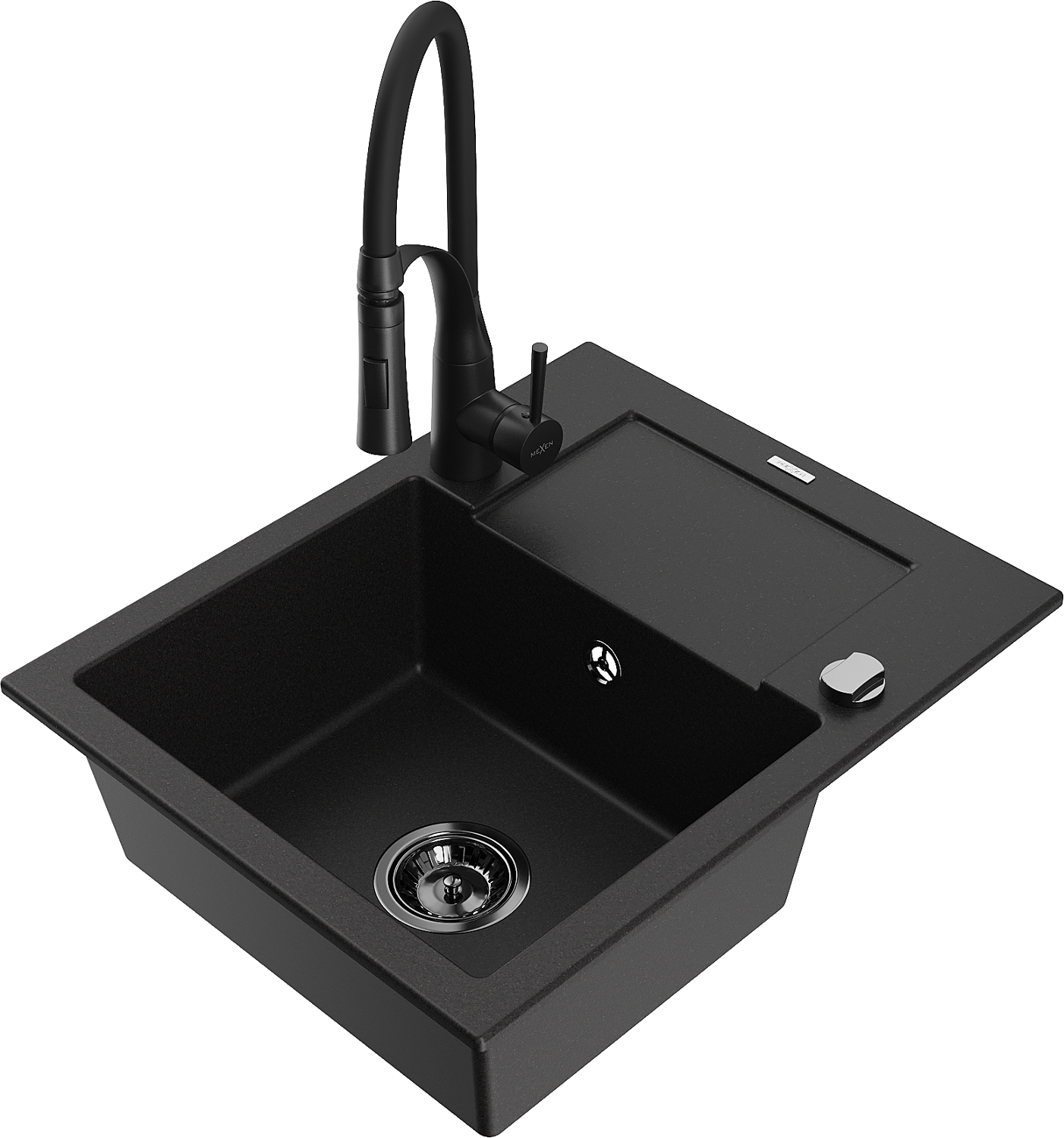 Mexen Enzo granite sink 1-bowl with drainer and Aster kitchen tap, black - 6506-77-73450-70-B