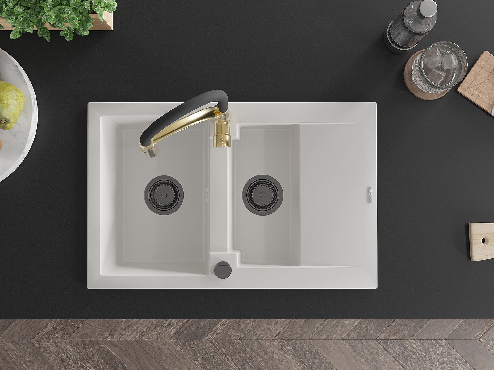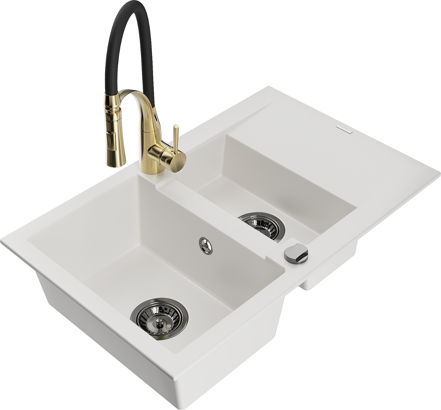 Mexen Gaspar granite sink 1.5-bowl with drainer and Aster kitchen tap, white - 6507-20-73450-57-B