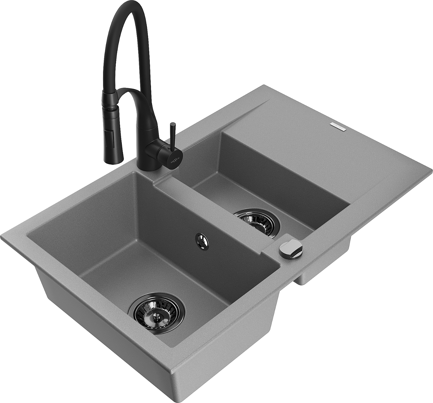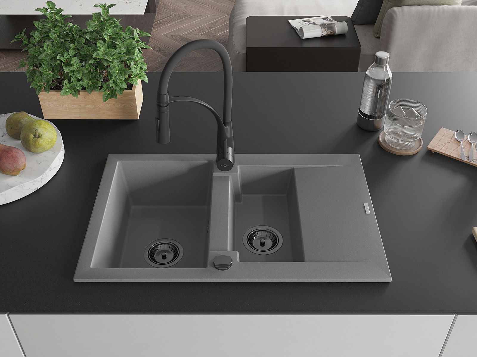 Mexen Gaspar granite sink 1.5-bowl with drainer and Aster kitchen tap, grey - 6507-71-73450-70-B