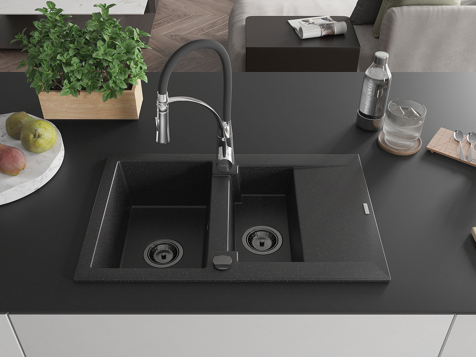 Mexen Gaspar granite kitchen sink 1.5-bowl with drainer and Aster kitchen tap, black/silver - 6507-73-73450-07-B