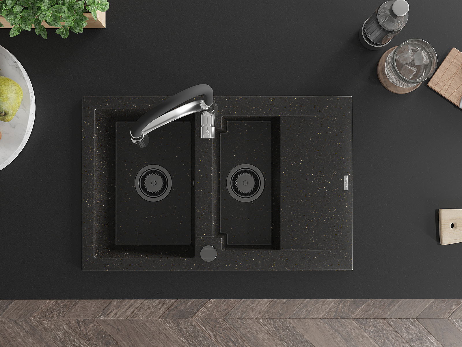 Mexen Gaspar granite sink 1.5-bowl with drainer and Aster kitchen tap, black/gold metallic - 6507-75-73450-07-B