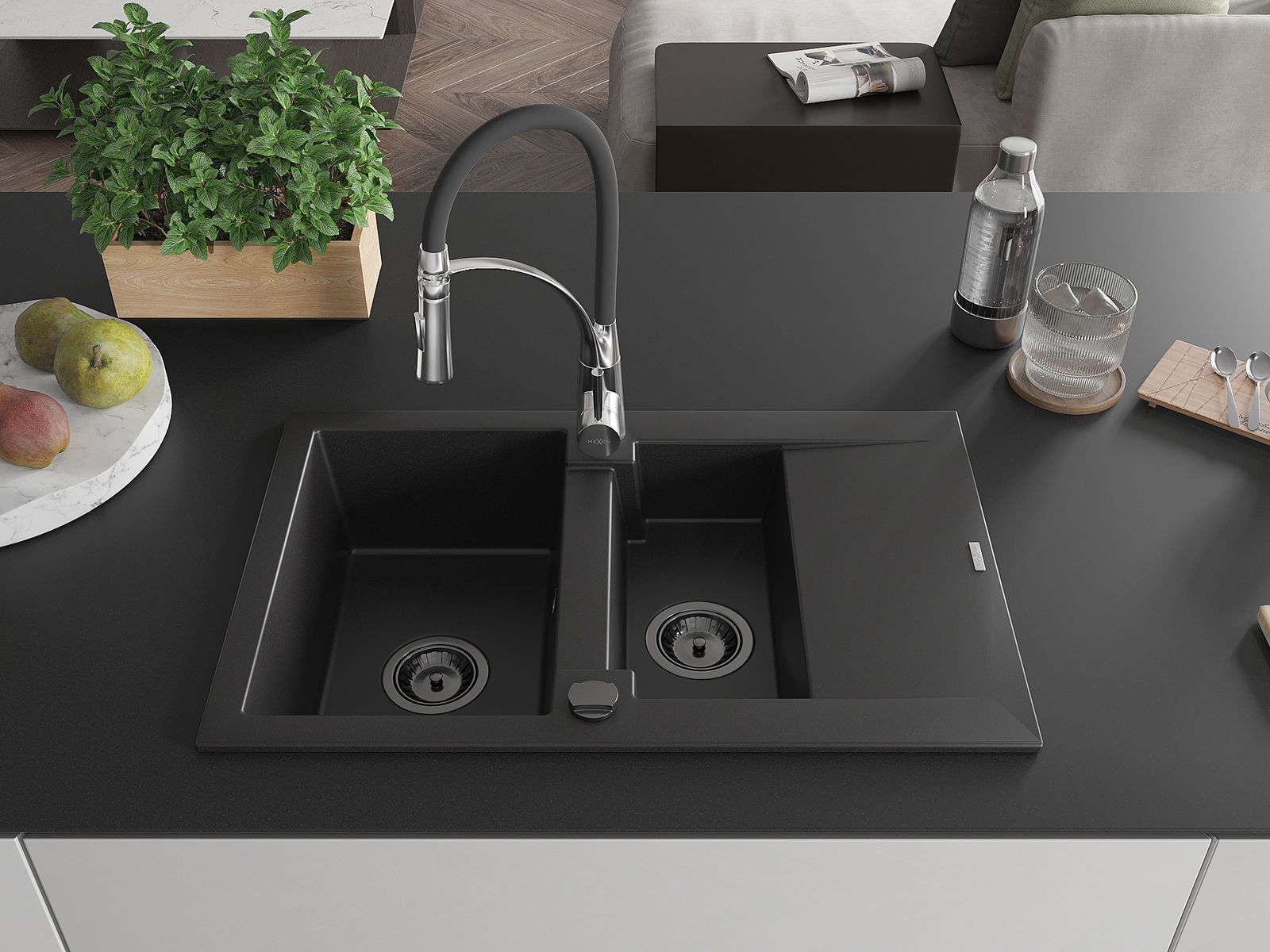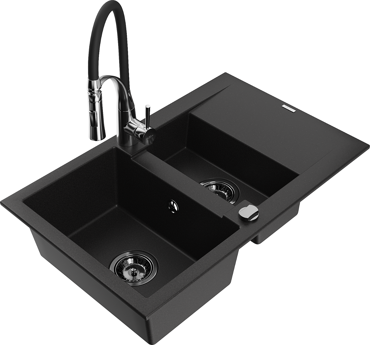 Mexen Gaspar granite sink 1.5-bowl with drainer and Aster kitchen tap, black - 6507-77-73450-07-B