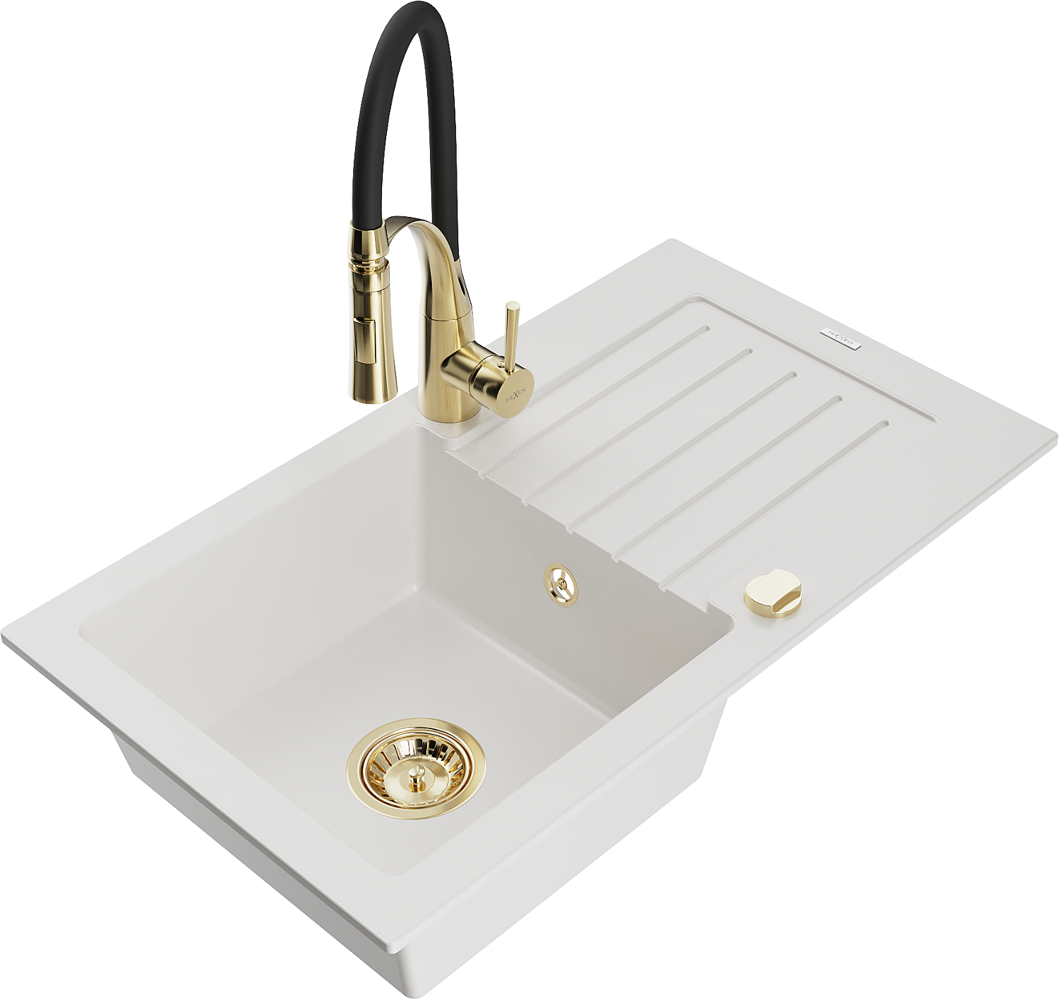 Mexen Pablo granite sink 1-bowl with drainer and Aster kitchen tap, white - 6510-20-73450-57-G