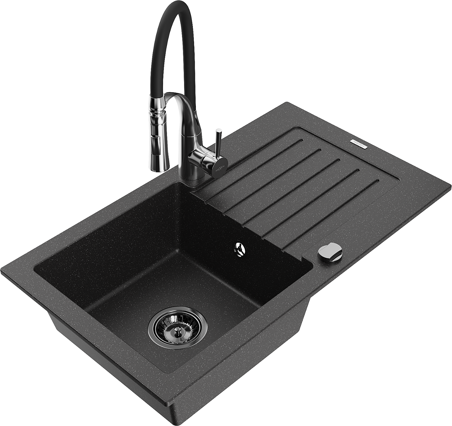 Mexen Pablo 1-bowl granite sink with drainer and Aster kitchen tap, black/silver metallic - 6510-73-73450-07-B