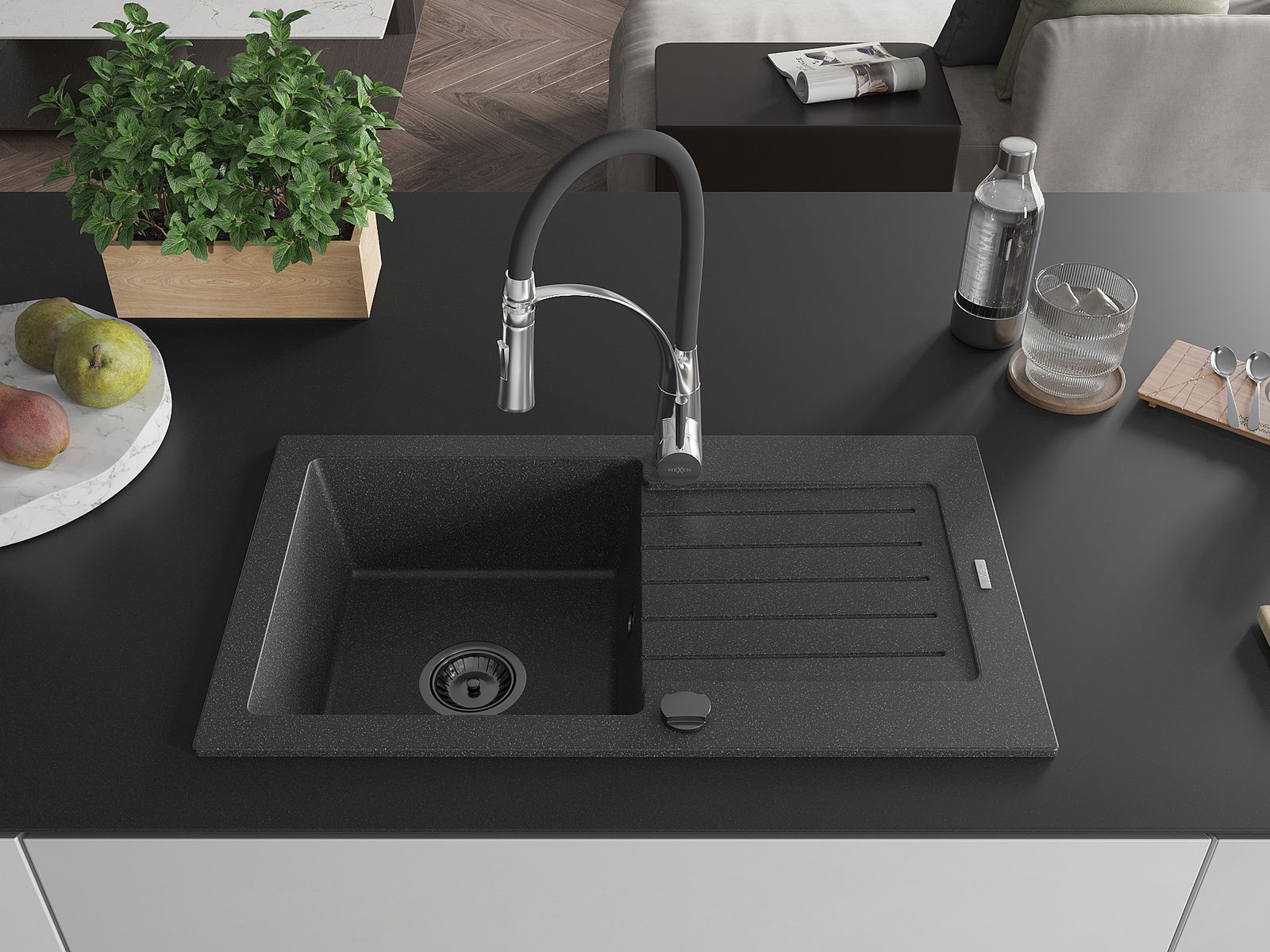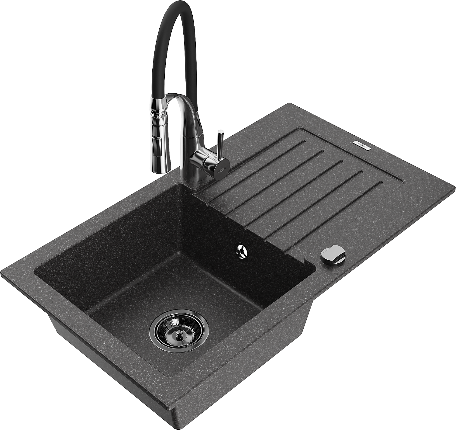 Mexen Pablo single-bowl granite sink with drainer and Aster kitchen tap, black speckled - 6510-76-73450-07-B