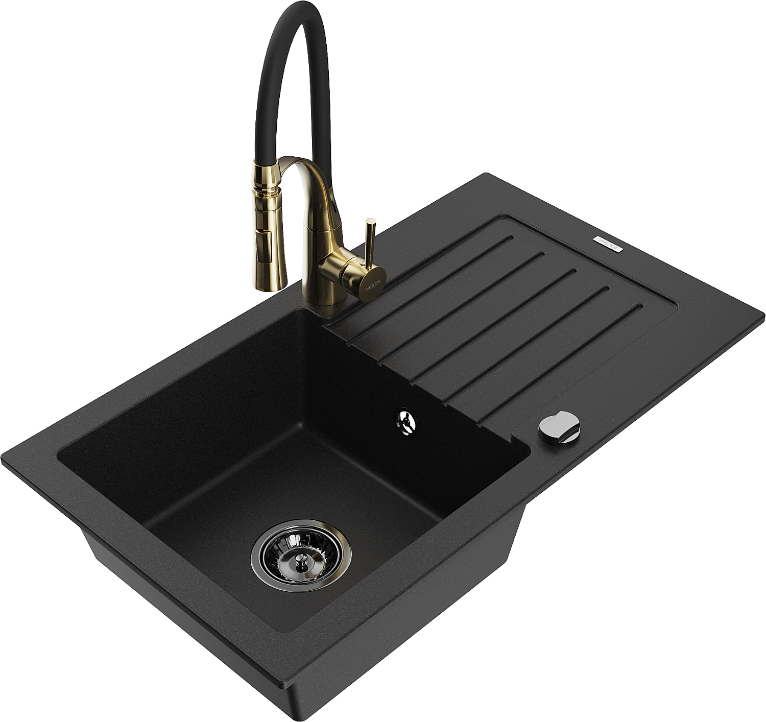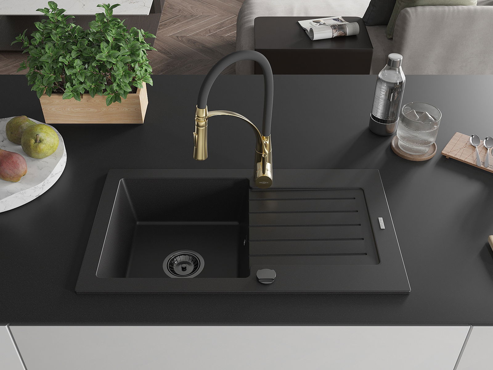 Mexen Pablo granite sink 1-bowl with drainer and Aster kitchen tap, black - 6510-77-73450-57-B