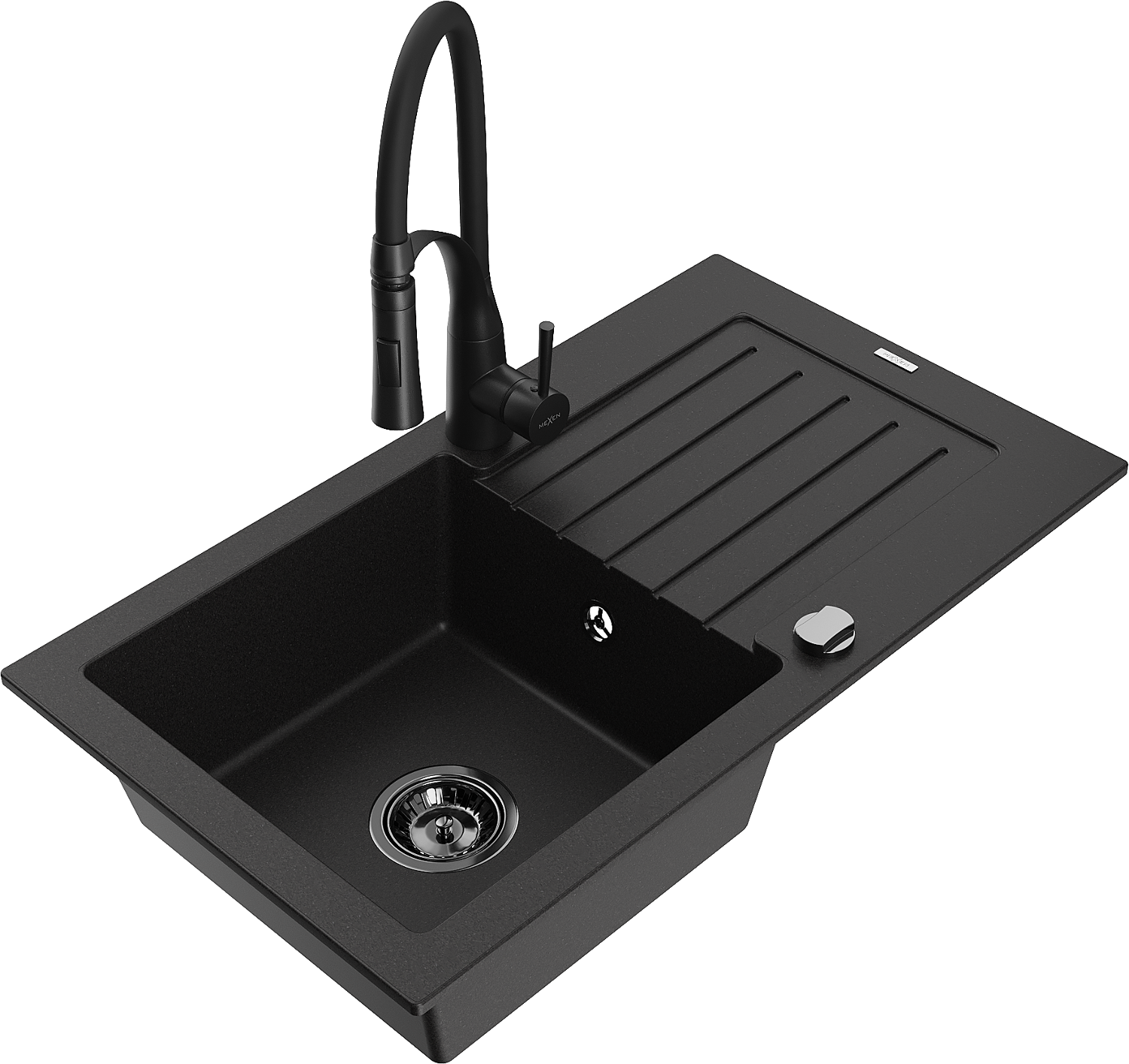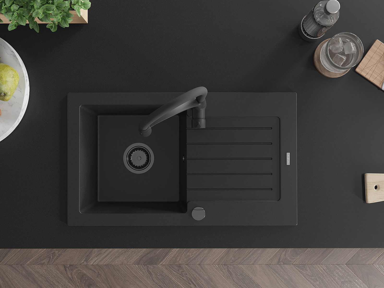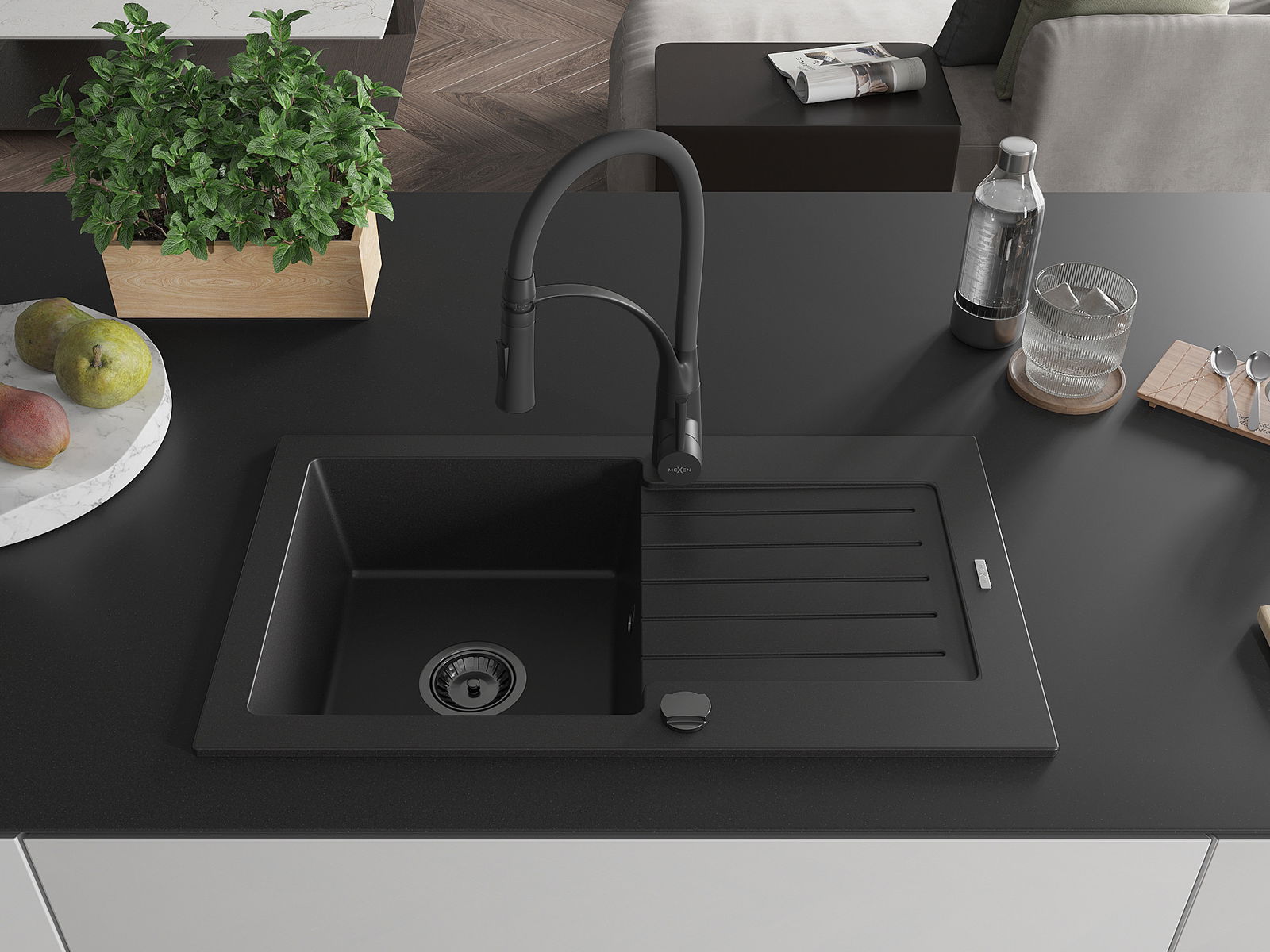 Mexen Pablo single-bowl granite sink with drainer and Aster kitchen tap, black - 6510-77-73450-70-B