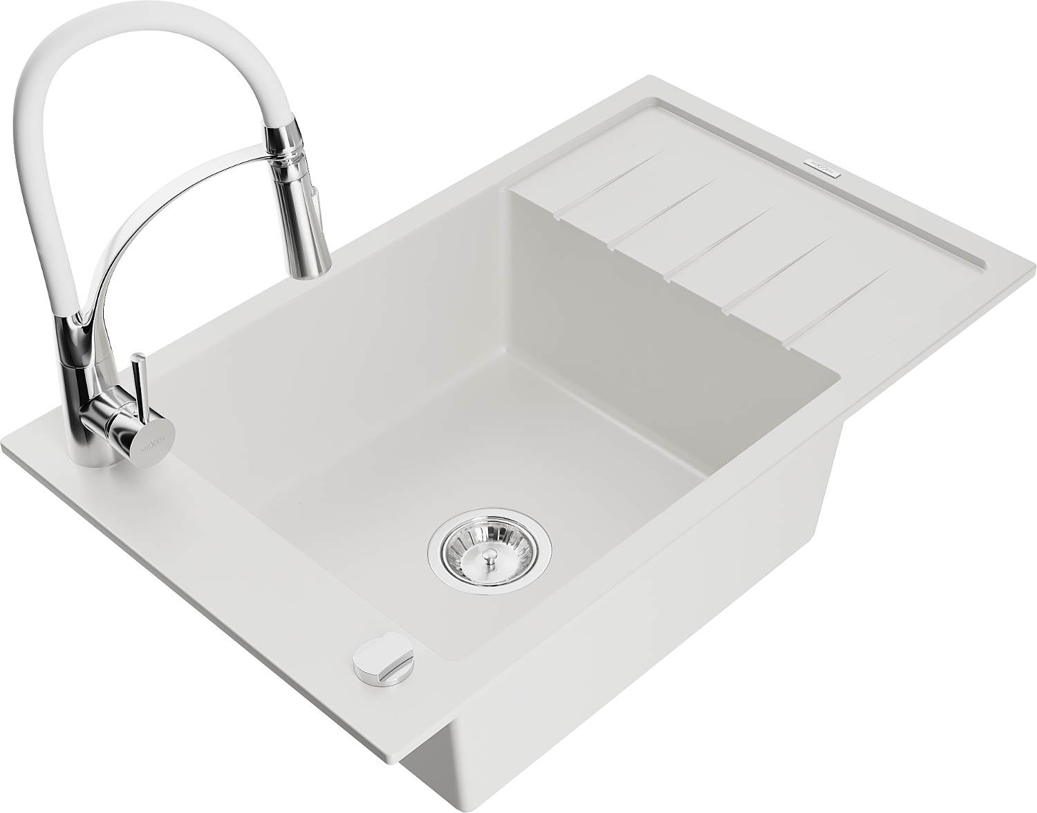 Mexen Elias granite sink 1-bowl with drainer and Aster kitchen tap, white - 6511-20-73450-02