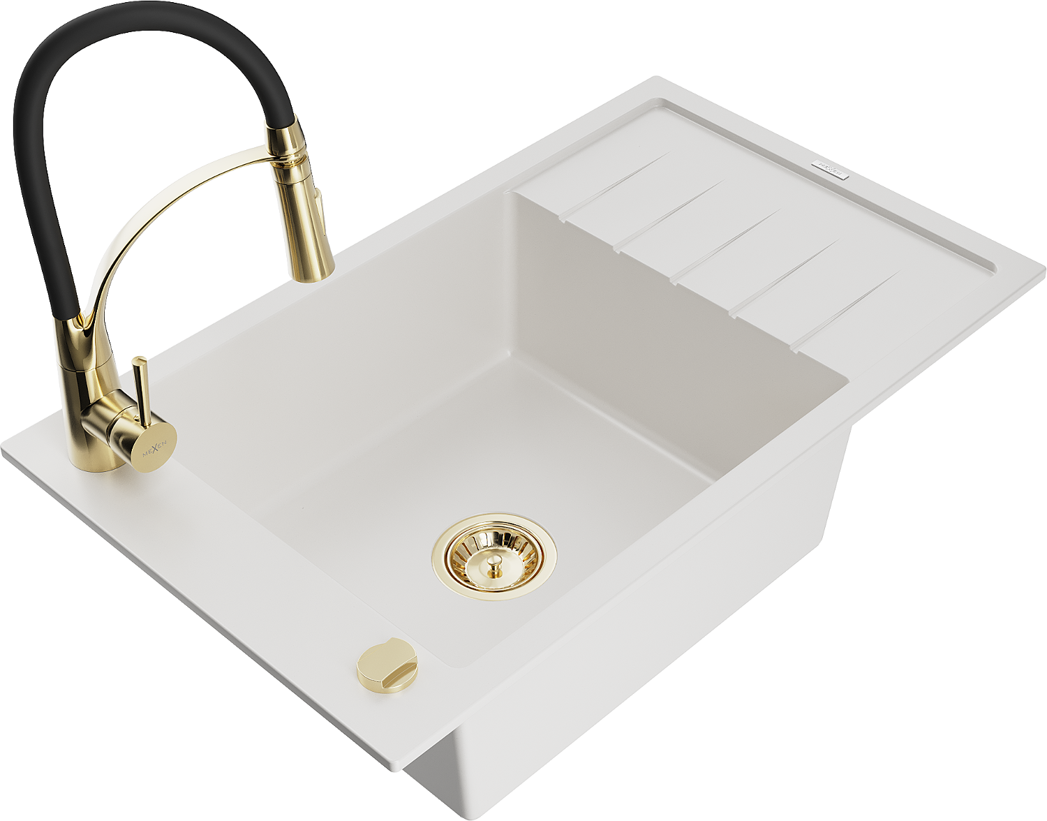 Mexen Elias granite sink 1-bowl with drainer and Aster kitchen tap, white - 6511-20-73450-57-G