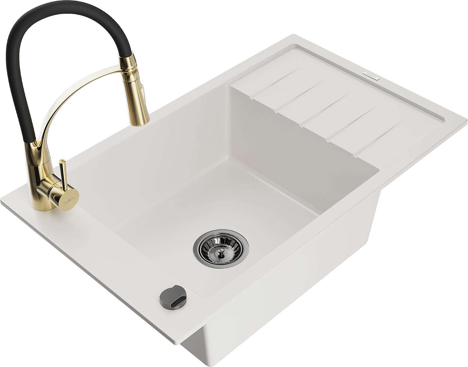 Mexen Elias 1-bowl granite sink with drainer and Aster kitchen tap, white - 6511-20-73450-57-B