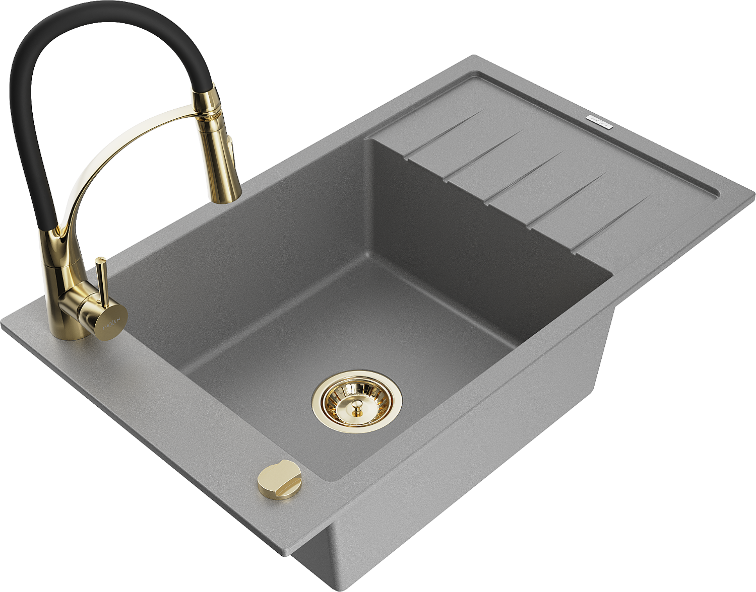 Mexen Elias 1-bowl granite sink with drainer and Aster kitchen tap, grey - 6511-71-73450-57-G